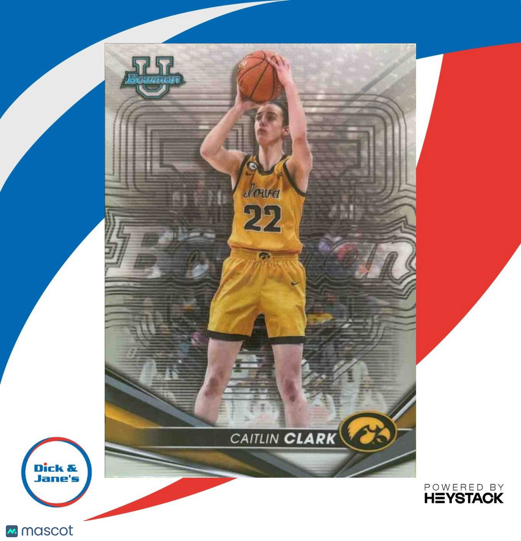 The 2022-23 Bowman University Best Caitlin Clark #50 Iowa Hawkeyes trading card is a must-have for NCAAB fans. Featuring the star player from the University of Iowa, this card showcases Clark's impressive skills on the court. Add this rare collectible to your sports card collection today! Listed With Mascot.