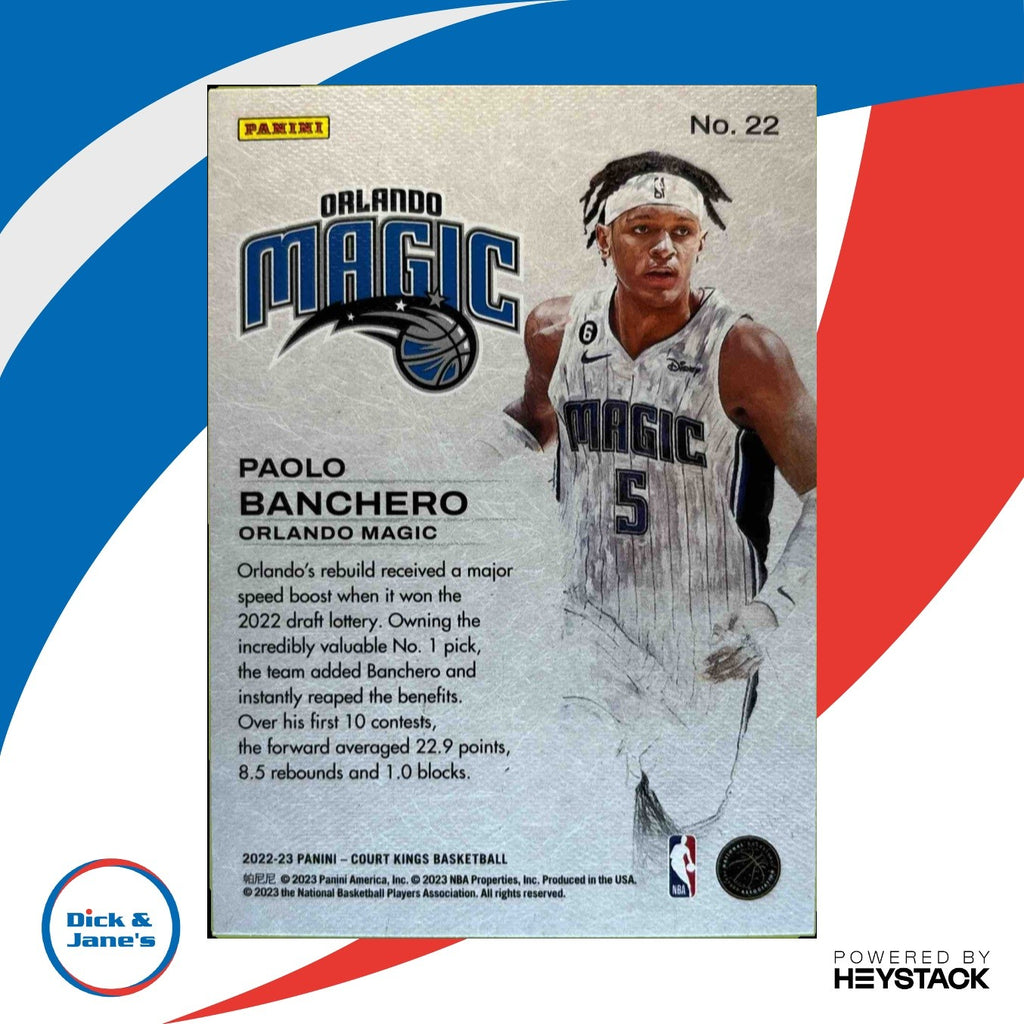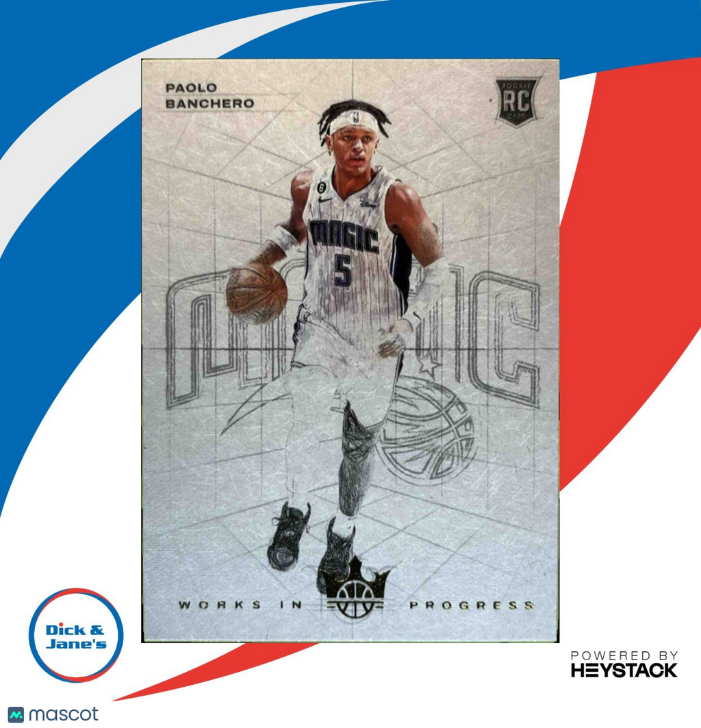 Powered by Frooition Home About Us Contact Other Baseball Baseball Rookies Baseball Inserts Baseball Game Used/Relics Baseball Autographed Football Football Rookies Football Inserts Football Game Used/Relics Football Autographed Basketball Basketball Rookies Basketball Inserts Basketball Game Used/Relics Basketball Autographed Hockey NASCAR Hard Cover Books Music CDs Baseball Boxes Baseball Pack Lots Football Boxes Football Pack Lots Other Boxes Othe Pack Lots Magic Singles 2022-23 Panini Court Kings Paolo Banchero Works in Progress #22 RC Orlando Magic 2022-23 Panini Court Kings Paolo Banchero Works in Progress #22 RC Orlando Magic Item Description Get your hands on the highly sought after 2022-23 Panini Court Kings Paolo Banchero Works in Progress #22 RC trading card featuring the talented rookie from the Orlando Magic. A must-have for any NBA card collection, this rookie card is sure to become a valuable piece of memorabilia. Don't miss out on the opportunity to own this rare and iconic sports trading card. About Us About Us PSA Grading Consignments Buying Cards EBay Live About Us Yes, there was a Dick & Jane! Originally founded in 1989, Dick & Jane's is Jacksonville's oldest hobby and collectibles store. Our focus is on the collector. We started small with comics, coins and cards and evolved based upon our customers needs and desired and now have 14 employees and over 5 million sportscards and nearly 700,000 different items on our dedicated singles sportscard website We have thousands of raw TCG cards in store. Magic the Gathering and Pokemon! We have Jacksonville s largest selection of graded sports and non-sports cards, all accessible on our website! We engage with our customers! Let us know what you would like to see in the store or changes you would suggest that we make. We would like to start hosting MONTHLY TRADE NIGHTS! We always are buying and trading! WE ARE THE LOCAL HOBBY STORE!!! Stop by if you are in the Jacksonville Area! We are right off I-95 near downtown. PSA Grading PSA Grading We