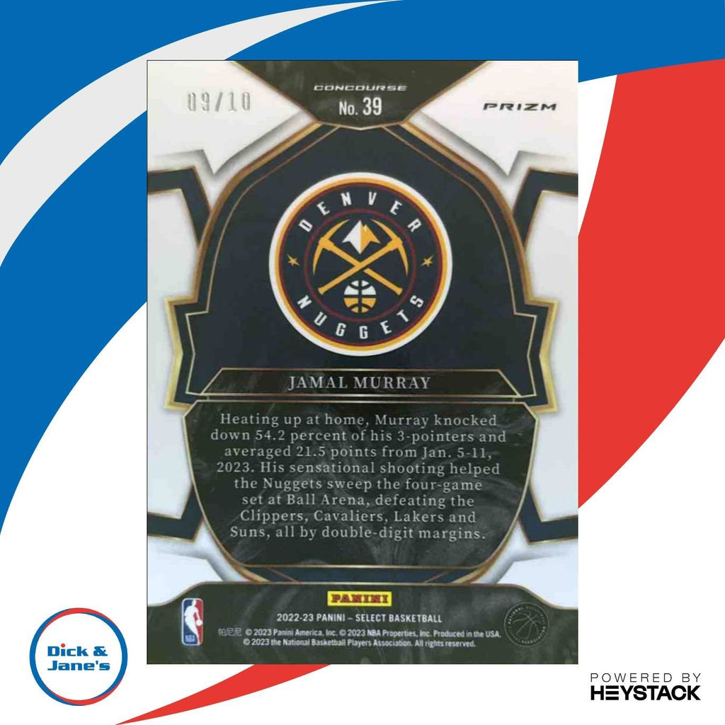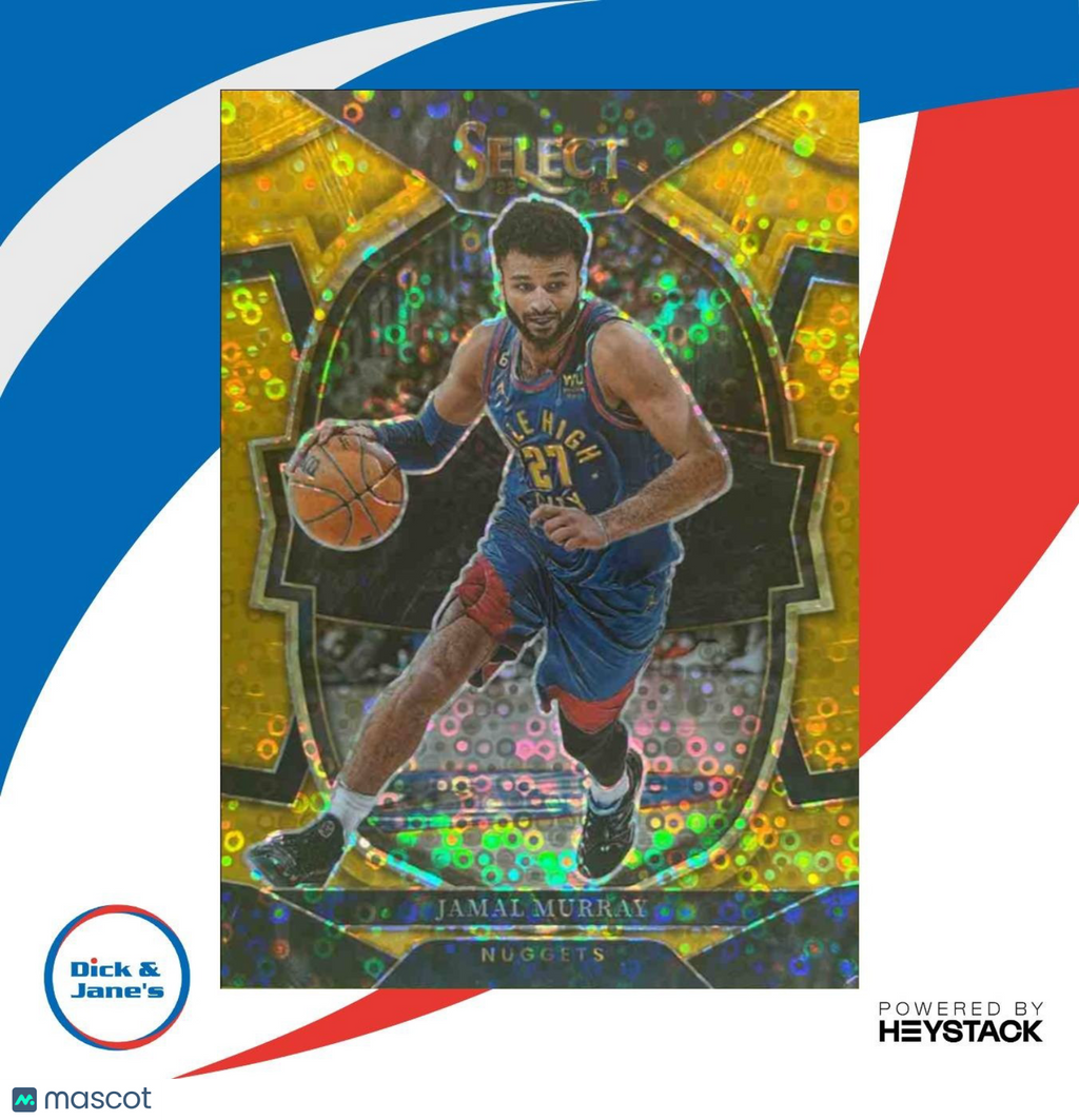 Add the electrifying Jamal Murray to your collection with this rare 2022-23 Panini Select Gold Disco Prizms card, graded 9/10. Featuring the Denver Nuggets star in action on the Concourse level, this limited edition card is a must-have for any NBA fan. Don't miss out on adding this piece of basketball history to your trading card lineup! Listed With Mascot.