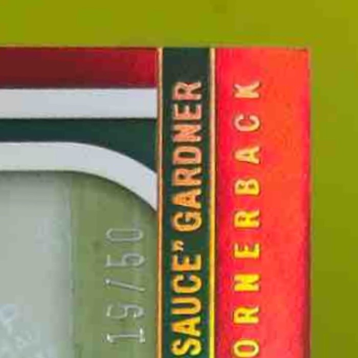 This 2022 Absolute Ahmad Sauce Gardner Signature Rookies card is rare and highly collectible. It features an autograph from the NFL rookie cornerback, with a limited edition red parallel numbering only 50. A must-have for any Jets fan or football card enthusiast. Listed With Mascot.