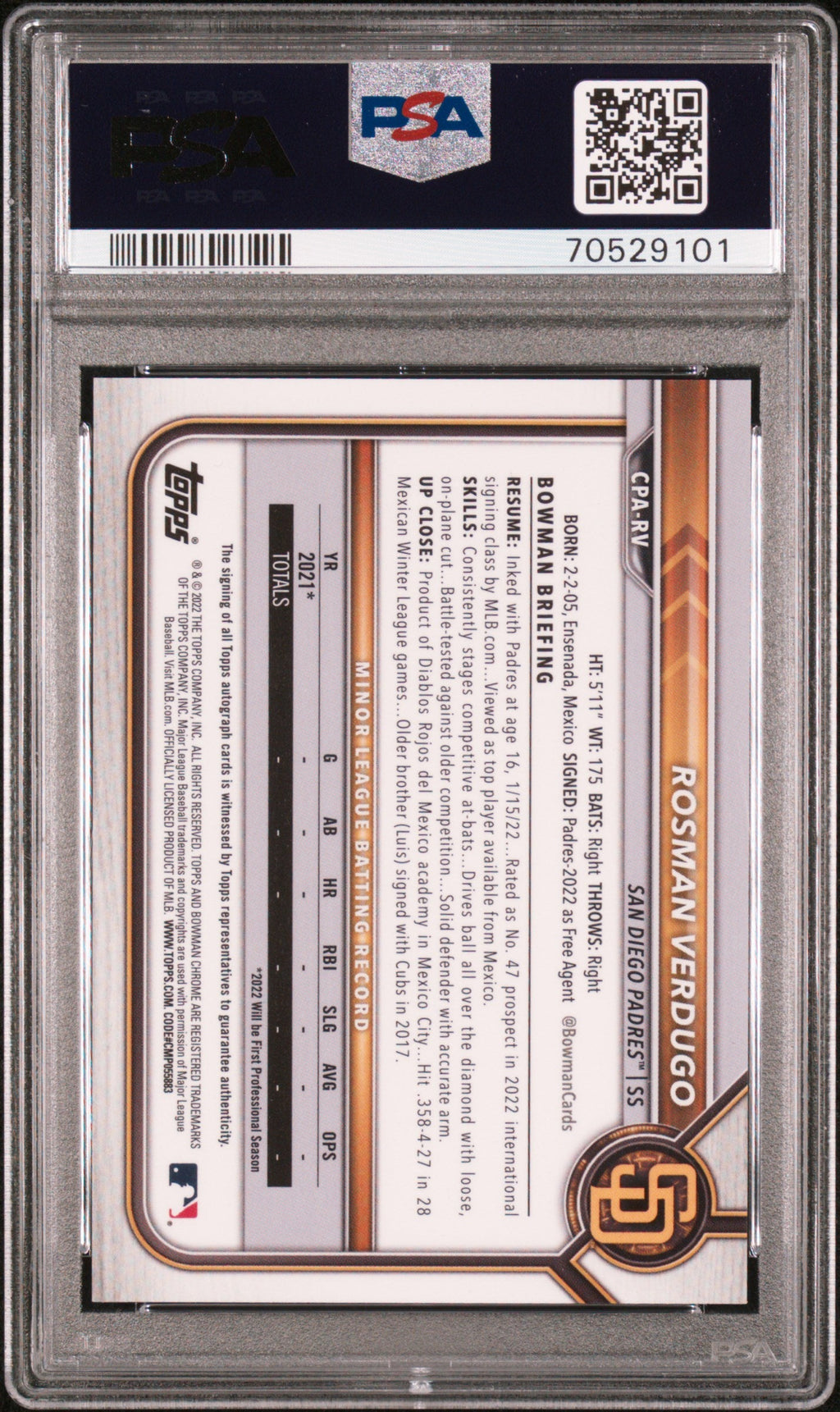 You are purchasing the following: 2022 Bowman Chrome Prospect Autographs Rosman Verdugo #CPARV PSA 9 . You will receive the exact item in the photographs. Note: Please do not connact us and asking the following: 1. What is the lowest you would take? Just make an offer. If the offer is automatically declined, you have your answer. 2. What the best you can do? See above. Not repling to an email is a reply. 3. Any room on this? See above. Not repling to an offer is a reply. 4. We ONLY do one counter offer, so please make your best offer the first time! Note: If the price off, in your option, please send your resaoning and an offer. We will review it. Note: We manage nearly 10 millon cards regularly and will adjust prices as errors are noticed or pointed out! Listed With Mascot.