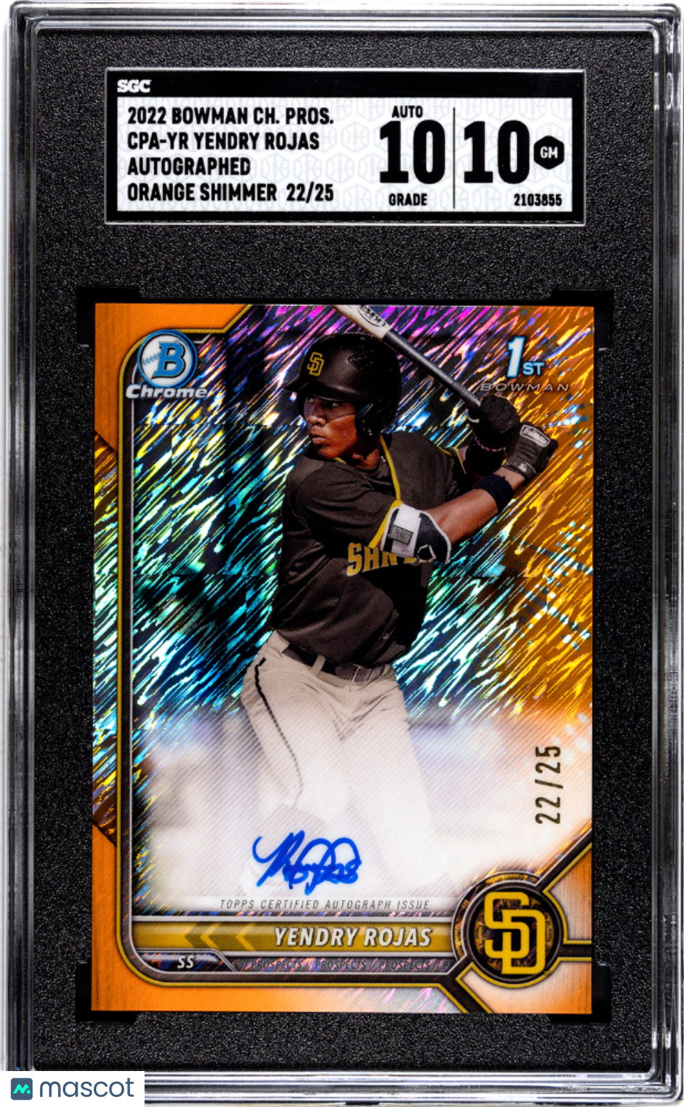 You are purchasing the following: 2022 Bowman Chrome Yendry Rojas Autograph Orange Shimmer Refractor 22/25 #CPA-YR SGC 10 . You will receive the exact item in the photographs. Note: Please do not connact us and asking the following: 1. What is the lowest you would take? Just make an offer. If the offer is automatically declined, you have your answer. 2. What the best you can do? See above. Not repling to an email is a reply. 3. Any room on this? See above. Not repling to an offer is a reply. 4. We ONLY do one counter offer, so please make your best offer the first time! Note: If the price off, in your option, please send your resaoning and an offer. We will review it. Note: We manage nearly 10 millon cards regularly and will adjust prices as errors are noticed or pointed out! Listed With Mascot.