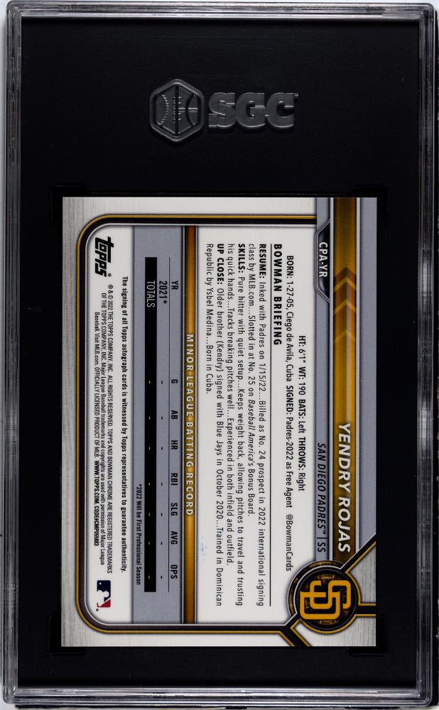 You are purchasing the following: 2022 Bowman Chrome Yendry Rojas Autograph Orange Shimmer Refractor 22/25 #CPA-YR SGC 10 . You will receive the exact item in the photographs. Note: Please do not connact us and asking the following: 1. What is the lowest you would take? Just make an offer. If the offer is automatically declined, you have your answer. 2. What the best you can do? See above. Not repling to an email is a reply. 3. Any room on this? See above. Not repling to an offer is a reply. 4. We ONLY do one counter offer, so please make your best offer the first time! Note: If the price off, in your option, please send your resaoning and an offer. We will review it. Note: We manage nearly 10 millon cards regularly and will adjust prices as errors are noticed or pointed out! Listed With Mascot.