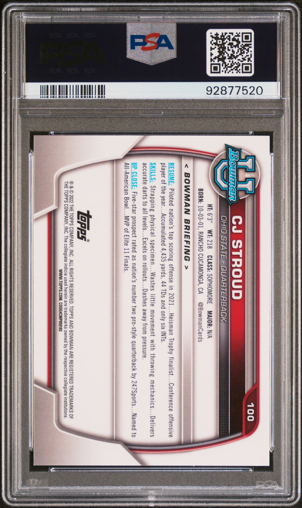 You are purchasing the following: 2022 Bowman University Chrome Prospects CJ Stroud #100 PSA 9 . You will receive the exact item in the photographs. Note: Please do not connact us and asking the following: 1. What is the lowest you would take? Just make an offer. If the offer is automatically declined, you have your answer. 2. What the best you can do? See above. Not repling to an email is a reply. 3. Any room on this? See above. Not repling to an offer is a reply. 4. We ONLY do one counter offer, so please make your best offer the first time! Note: If the price off, in your option, please send your resaoning and an offer. We will review it. Note: We manage nearly 10 millon cards regularly and will adjust prices as errors are noticed or pointed out! Listed With Mascot.
