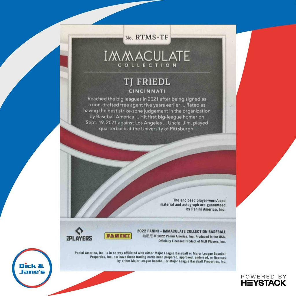 Collect the highly sought-after 2022 Immaculate TJ Friedl Rookie Triple Patch Auto Silver /25 RC Reds trading card! This rare MLB card features a Rookie Card Auto of TJ Friedl with three patches, limited to only 25 copies. A must-have for any sports card collector or Cincinnati Reds fan. Grab yours now before it's gone! Listed With Mascot.