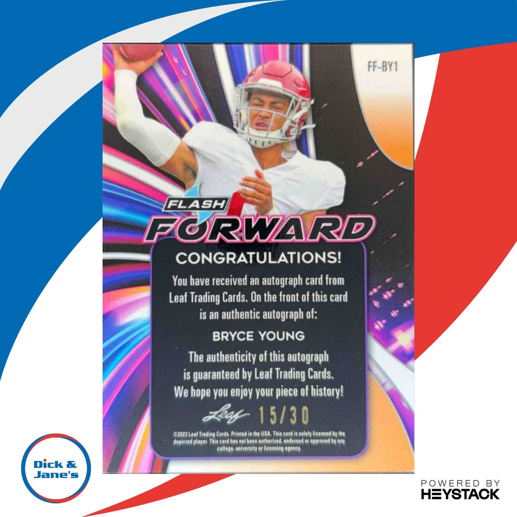 Powered by Frooition Home About Us Contact Other Baseball Baseball Rookies Baseball Inserts Baseball Game Used/Relics Baseball Autographed Football Football Rookies Football Inserts Football Game Used/Relics Football Autographed Basketball Basketball Rookies Basketball Inserts Basketball Game Used/Relics Basketball Autographed Hockey NASCAR Hard Cover Books Music CDs Baseball Boxes Baseball Pack Lots Football Boxes Football Pack Lots Other Boxes Othe Pack Lots Magic Singles 2022 Leaf Flash Bryce Young Forward Auto Kaleidoscope Silver 15/30 RC Alabama 2022 Leaf Flash Bryce Young Forward Auto Kaleidoscope Silver 15/30 RC Alabama Item Description Limited edition 2022 Bryce Young Forward Auto Kaleidoscope Silver trading card from Leaf Flash. Features a stunning Rookie Card (RC) autograph of the Alabama quarterback. Only 30 made, with this being number 15. A must-have for any NCAAF collector. About Us About Us PSA Grading Consignments Buying Cards EBay Live About Us Yes, there was a Dick & Jane! Originally founded in 1989, Dick & Jane's is Jacksonville's oldest hobby and collectibles store. Our focus is on the collector. We started small with comics, coins and cards and evolved based upon our customers needs and desired and now have 14 employees and over 5 million sportscards and nearly 700,000 different items on our dedicated singles sportscard website We have thousands of raw TCG cards in store. Magic the Gathering and Pokemon! We have Jacksonville s largest selection of graded sports and non-sports cards, all accessible on our website! We engage with our customers! Let us know what you would like to see in the store or changes you would suggest that we make. We would like to start hosting MONTHLY TRADE NIGHTS! We always are buying and trading! WE ARE THE LOCAL HOBBY STORE!!! Stop by if you are in the Jacksonville Area! We are right off I-95 near downtown. PSA Grading PSA Grading We