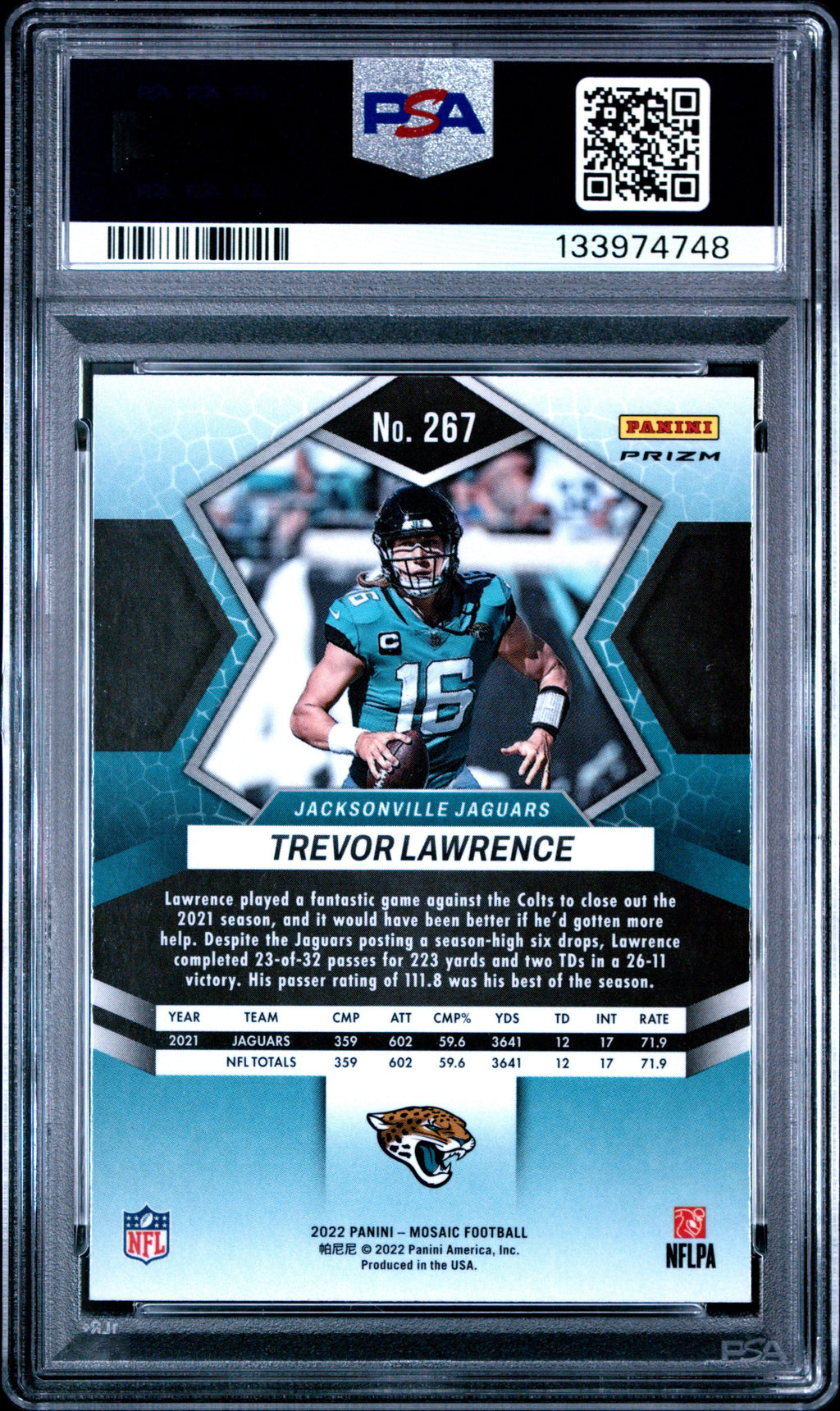 2022 Panini Mosaic Trevor Lawrence Camo Pink National Pride Rookie #267 PSA 10 GEM MINT Jacksonville Jaguars Don’t miss your chance to own this stunning 2022 Panini Mosaic Trevor Lawrence Camo Pink National Pride Rookie card, graded PSA 10 GEM MINT! This highly sought-after card features the Jacksonville Jaguars’ star quarterback in a vibrant Camo Pink parallel, making it a standout addition to any football card collection. With a population of just 76 and none graded higher, this is a rare opportunity for collectors and fans alike. Certified by Professional Sports Authenticator (PSA) with certification number 133974748, this rookie card showcases Trevor Lawrence’s rise as one of the NFL’s most exciting young talents. Whether you’re a dedicated Jaguars supporter or a serious card investor, this PSA 10 GEM MINT rookie is a must-have centerpiece for your collection! Set: 2022 Panini Mosaic Certification Number: 133974748 Grader: Professional Sports Authenticator (PSA) Year Manufactured: 2022 Grade: 10 Player/Athlete: Trevor Lawrence Graded: Yes Sport: Football Population Higher: 0 Parallel/Variety: Camo Pink Manufacturer: Panini Population: 76 Team: Jacksonville Jaguars Features: Rookie, National Pride Card Number: 267 Listed With Mascot.