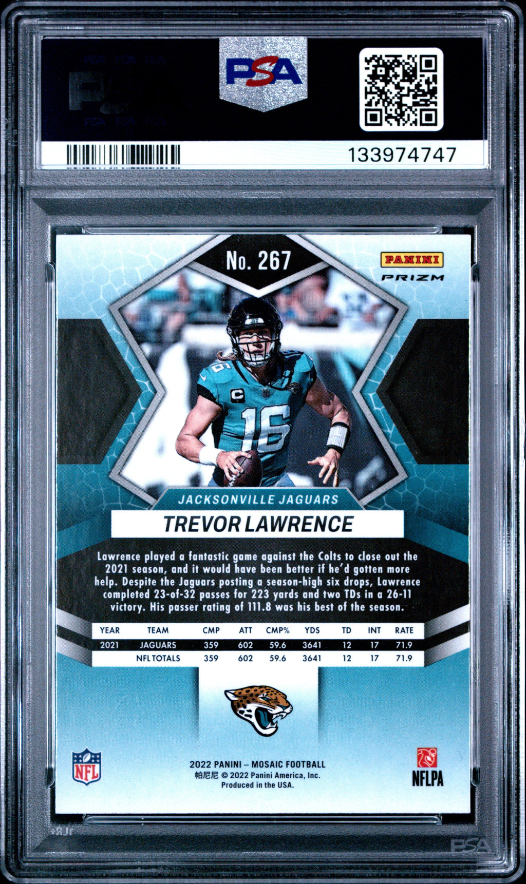 2022 Panini Mosaic Trevor Lawrence National Pride Rookie #267 PSA 10 Jacksonville Jaguars Don’t miss your chance to own this stunning 2022 Panini Mosaic Trevor Lawrence National Pride Rookie card, graded PSA 10 Gem Mint! With only 29 cards at this grade and none higher, this is a must-have for serious collectors and Jaguars fans. Featuring the iconic National Pride design, this rare rookie card is a standout addition to any football card collection. This card is officially graded by Professional Sports Authenticator (PSA) and comes with certification number 133974747 for guaranteed authenticity. Celebrate Trevor Lawrence’s rookie year and secure a piece of NFL history—these high-grade cards are in high demand, so act fast before it’s gone! Set: 2022 Panini Mosaic Certification Number: 133974747 Grader: Professional Sports Authenticator (PSA) Year Manufactured: 2022 Grade: 10 Player/Athlete: Trevor Lawrence Graded: Yes Sport: Football Population Higher: 0 Manufacturer: Panini Population: 29 Team: Jacksonville Jaguars Features: Rookie, National Pride Card Number: 267 Listed With Mascot.