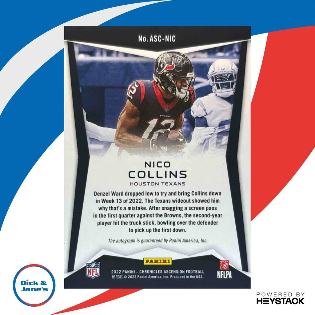 This 2022 Panini Chronicles Nico Collins Ascension Auto #ASC-NIC trading card is a must-have for Houston Texans fans. It features an authentic autograph from the talented wide receiver, making it a valuable addition to any collection. Don't miss out on owning this limited edition NFL card! Listed With Mascot.