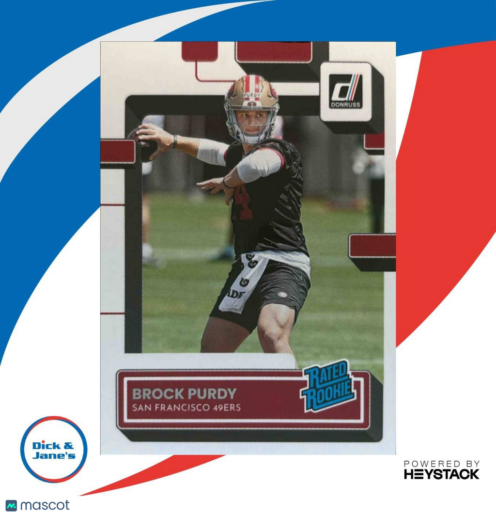 Own a piece of NFL history with the 2022 Panini Donruss Brock Purdy #374 RC Rated Rookie trading card. This San Francisco 49ers quarterback is sure to make a splash in the league. Don't miss out on adding this collectible card to your collection! #NFL #RatedRookie #TradingCard Listed With Mascot.