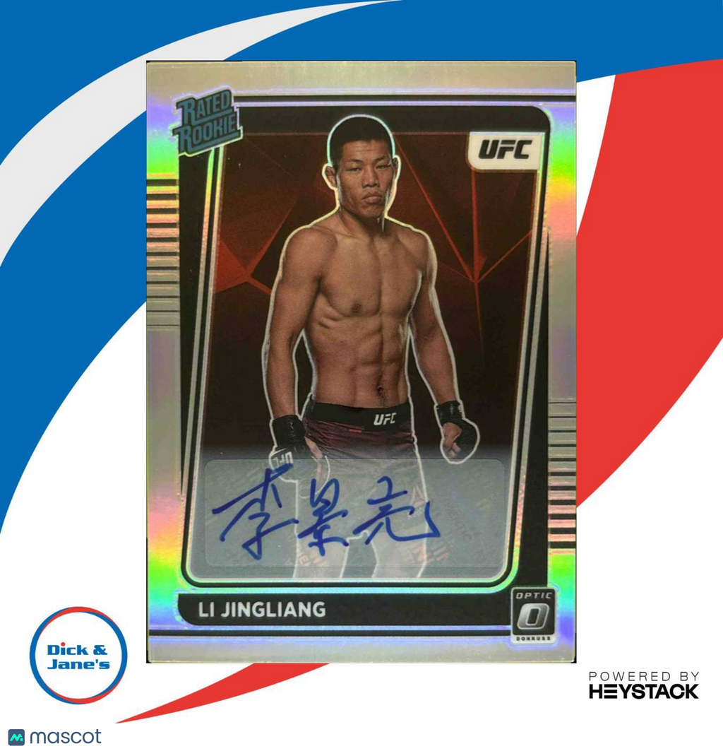 The 2022 Panini Donruss Optic Holo UFC Li Jingliang Signatures Rated Rookie Auto card is a must-have for any UFC fan or collector. This rare card features an authentic signature from the rising star Li Jingliang, making it a valuable addition to any collection. Don't miss your chance to own a piece of UFC history with this limited edition card. Listed With Mascot.