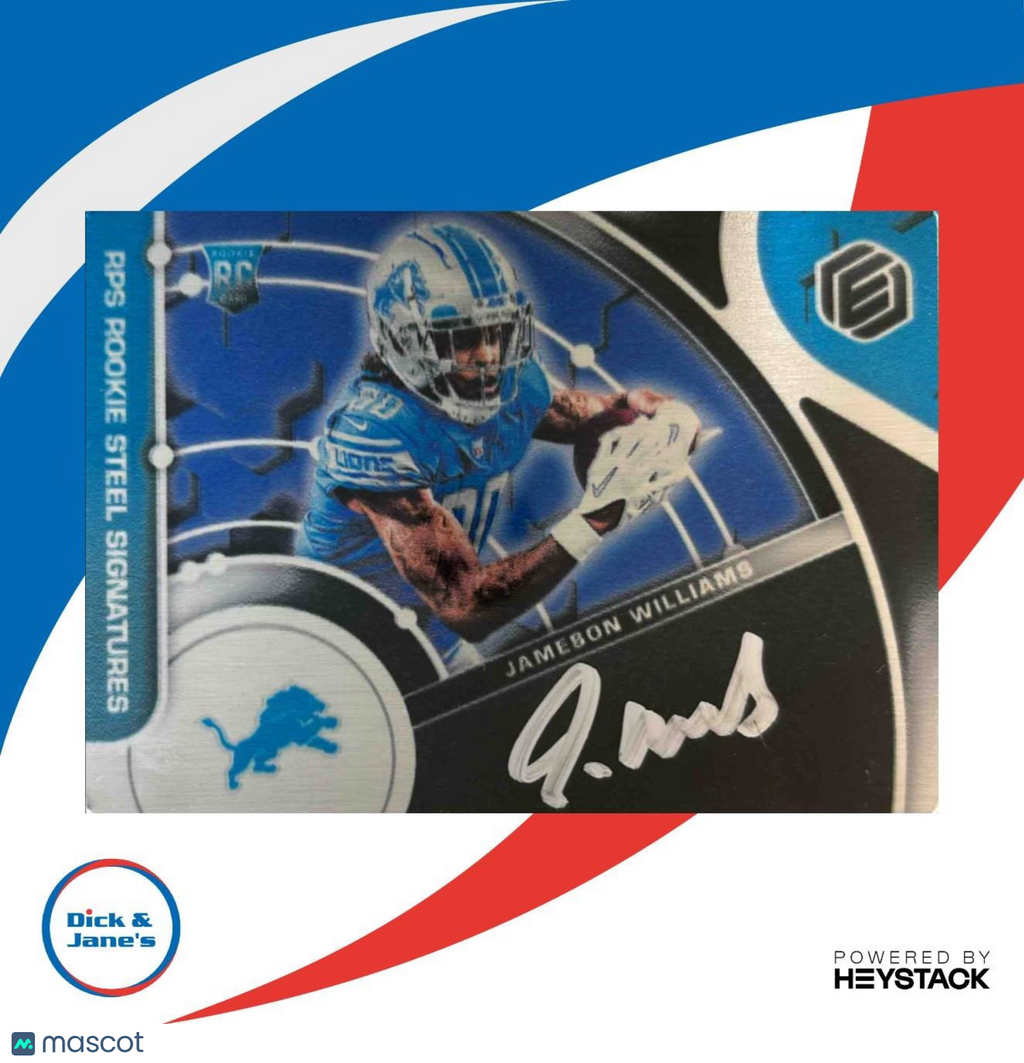 Rare and highly sought after 2022 Panini Elements Jameson Williams Cobalt #126 Autograph Rookie Card featuring the Detroit Lions wide receiver. Limited to only 27 copies, this card is a must-have for any NFL collector. Don't miss your chance to own a piece of football history! Listed With Mascot.
