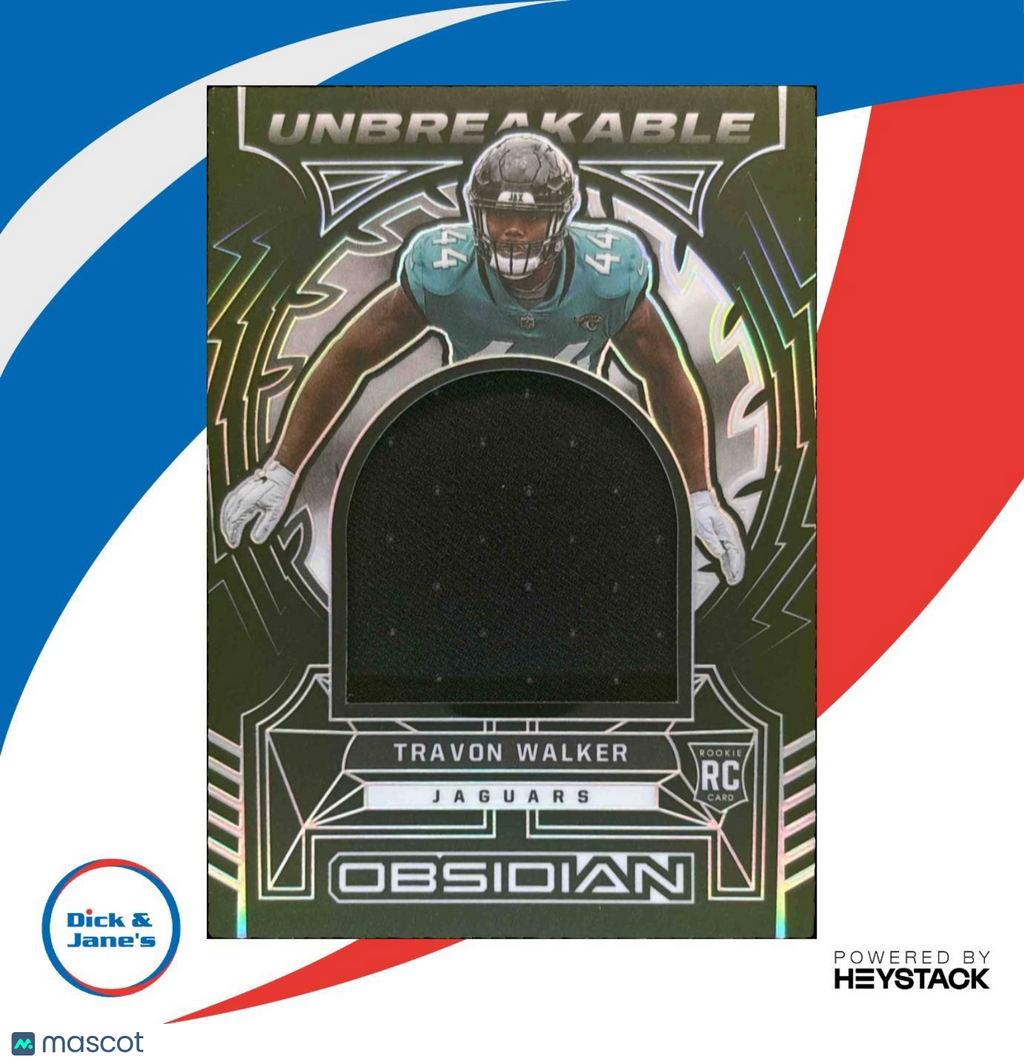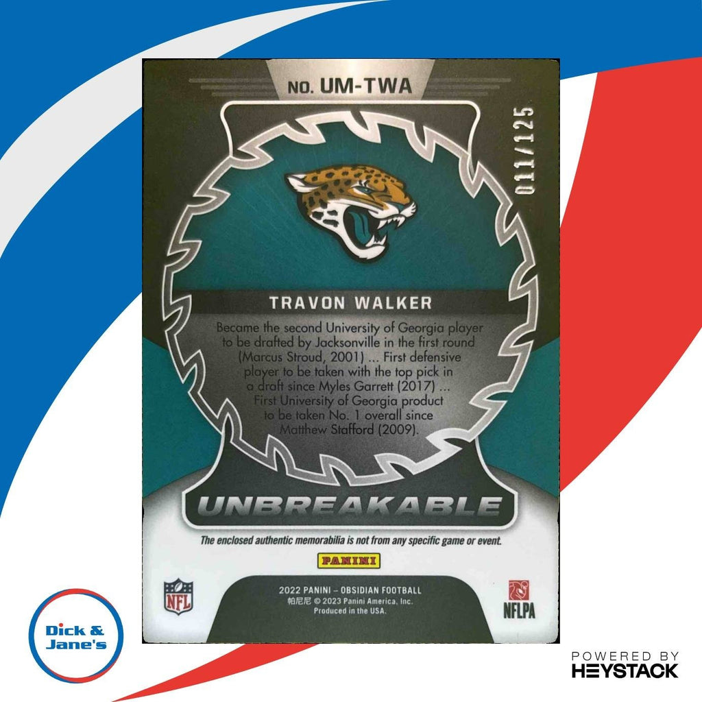 The 2022 Panini Obsidian Travon Walker Unbreakable Material /125 RC Jaguars card is a must-have for any NFL fan. This rookie card features a unique design, limited edition numbering, and a piece of game-worn material. Add this rare collectible to your trading card collection today! Listed With Mascot.
