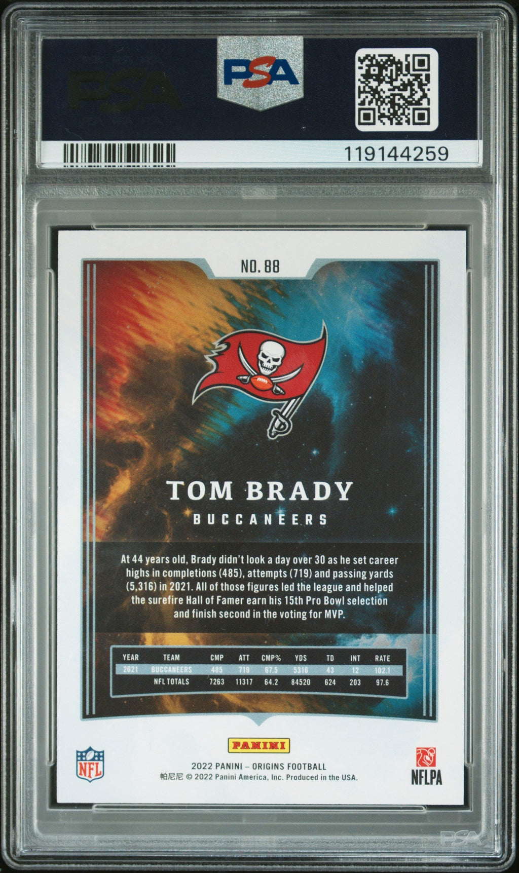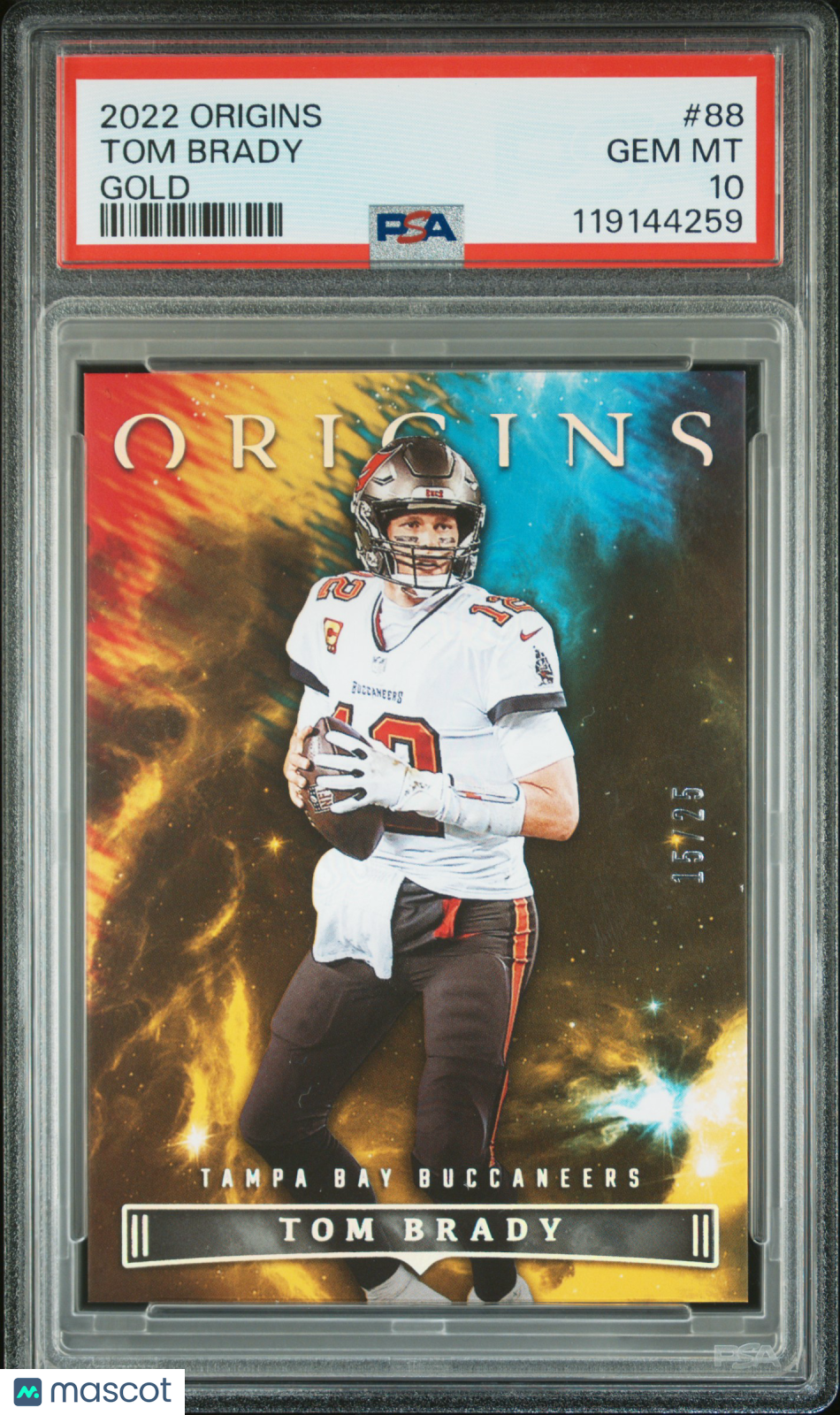 2022 Panini Origins Tom Brady Gold 15/25 #88 PSA 10 GEM MINT Tampa Bay Buccaneers Don’t miss your chance to own a rare piece of NFL history with this stunning 2022 Panini Origins Tom Brady Gold parallel, serial numbered 15/25 and professionally graded PSA 10 GEM MINT! This card is a true collector’s gem, featuring the legendary quarterback in his Tampa Bay Buccaneers uniform, and is one of only two in existence with none graded higher—making it a must-have for serious Brady fans and high-end football card investors. With its eye-catching gold parallel, low serial number, and pristine PSA 10 grade, this card stands out in any collection. Whether you’re a dedicated Buccaneers supporter or an avid Tom Brady enthusiast, this exceptional card is the perfect centerpiece to showcase your passion for the game. Act fast—opportunities like this don’t come around often! League: National Football League (NFL) Set: 2022 Panini Origins Certification Number: 119144259 Grader: Professional Sports Authenticator (PSA) Year Manufactured: 2022 Grade: 10 Player/Athlete: Tom Brady Serial Number: 15/25 Graded: Yes Sport: Football Population Higher: 0 Parallel/Variety: Gold Manufacturer: Panini Population: 2 Team: Tampa Bay Buccaneers Features: Serial Numbered Card Number: 88 Listed With Mascot.