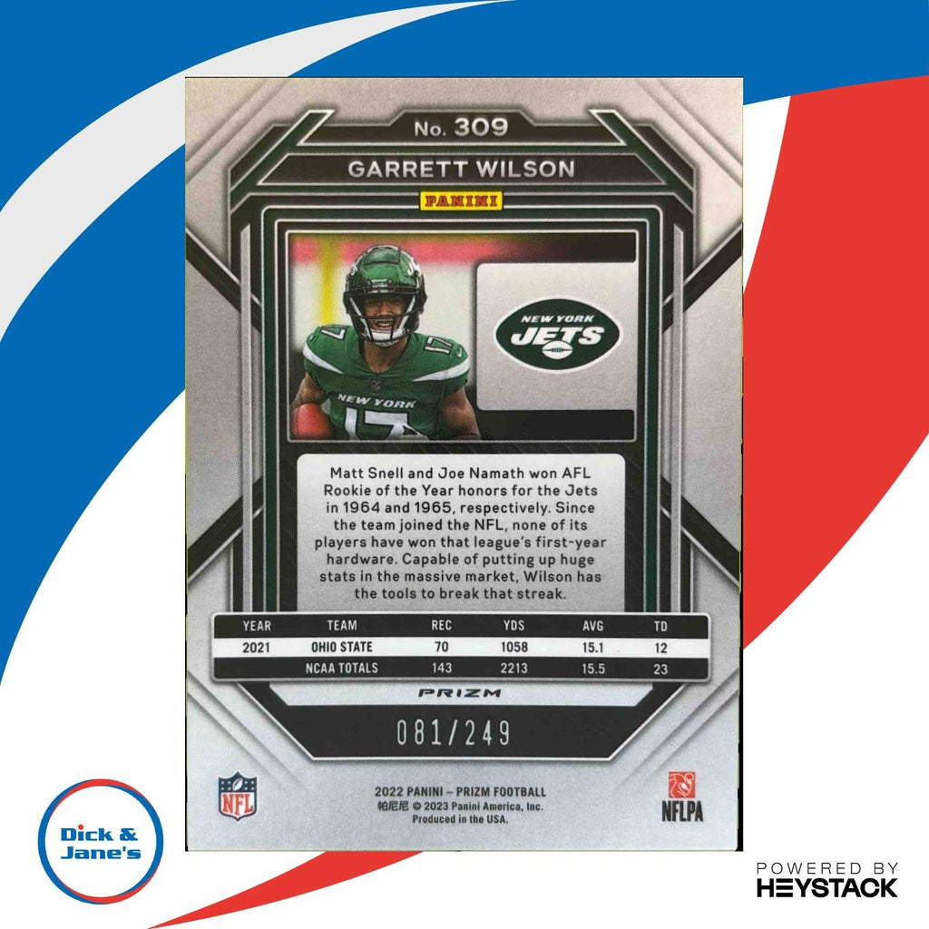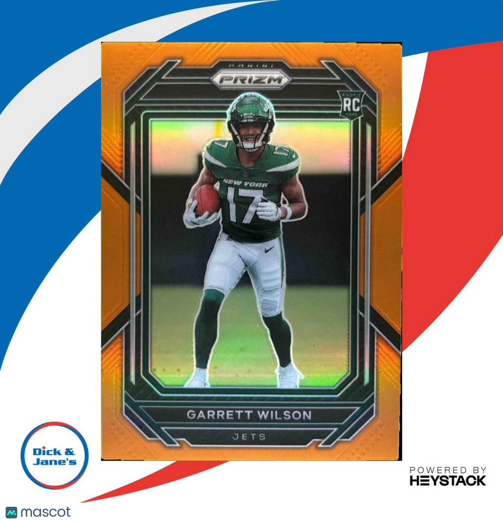 Add the highly sought-after 2022 Panini Prizm Garrett Wilson Orange RC #309 to your collection! Limited edition 81/249, featuring the rising star's image in New York Jets uniform. A must-have for any NFL trading card enthusiast. Don't miss out on this rare gem! Listed With Mascot.