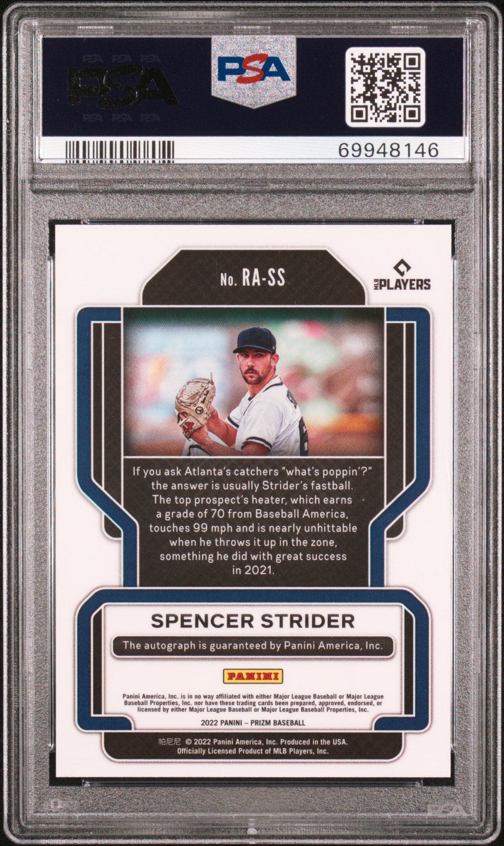 You are purchasing the following: 2022 Panini Prizm Rookie Autographs Spencer Strider #RASS PSA 9 NYY. You will receive the exact item in the photographs. Note: Please do not connact us and asking the following: 1. What is the lowest you would take? Just make an offer. If the offer is automatically declined, you have your answer. 2. What the best you can do? See above. Not repling to an email is a reply. 3. Any room on this? See above. Not repling to an offer is a reply. 4. We ONLY do one counter offer, so please make your best offer the first time! Note: If the price off, in your option, please send your resaoning and an offer. We will review it. Note: We manage nearly 10 millon cards regularly and will adjust prices as errors are noticed or pointed out! Listed With Mascot.