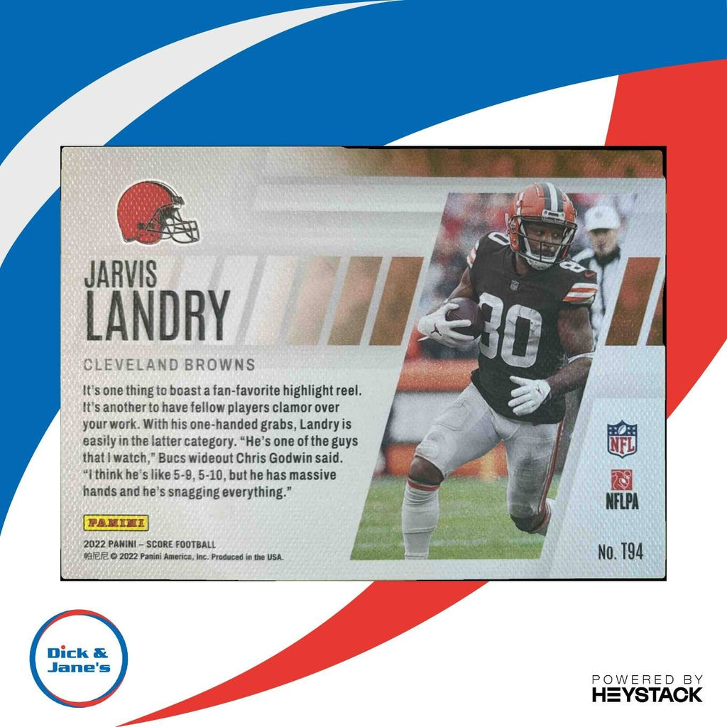 The 2022 Panini Score Jarvis Landry Top 100 #T94 Cleveland Browns trading card features the talented wide receiver in his Top 100 ranking. A must-have collectible for any NFL fan or trading card enthusiast. Perfect addition to any football card collection. Listed With Mascot.