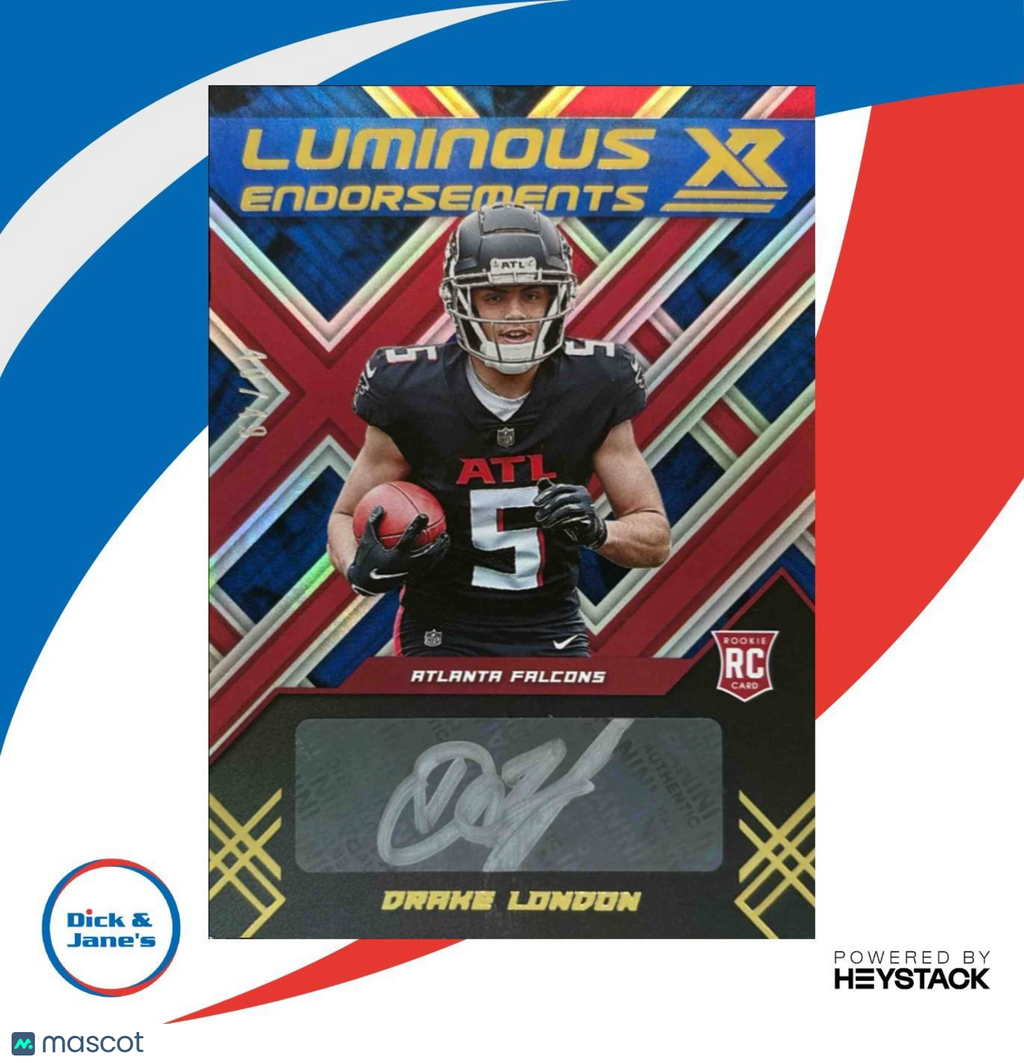 Rare and dazzling 2022 Panini XR Drake London Luminous Endorsements Blue /49 Auto RC Falcons trading card featuring a signature from the NFL rookie. This Autograph RC Auto is a must-have for any sports card collector looking for a unique and limited edition addition to their collection. Listed With Mascot.