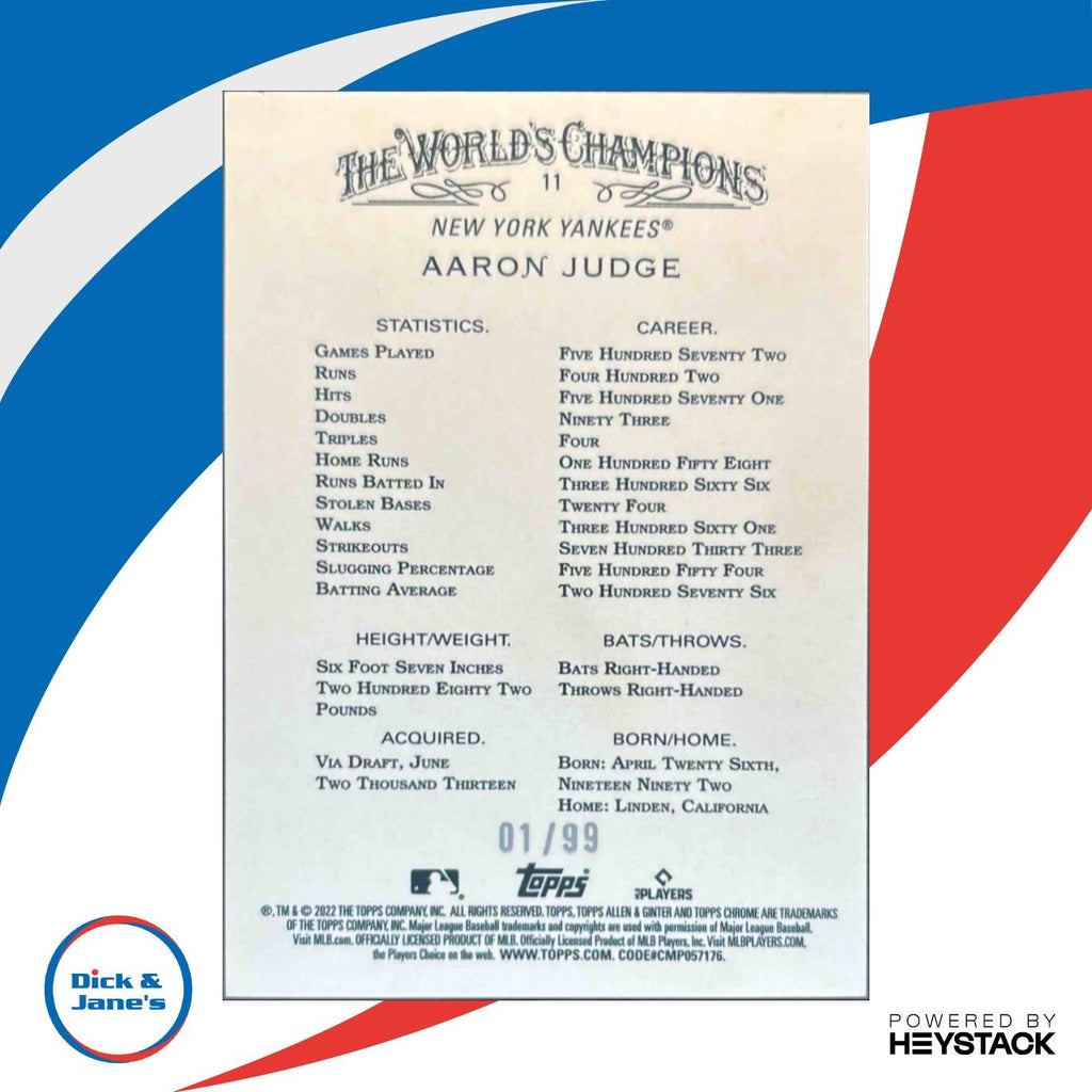 2022 Topps Allen & Ginter Chrome Aaron Judge Green Refractor 1/99 #11 Yankees Listed With Mascot.