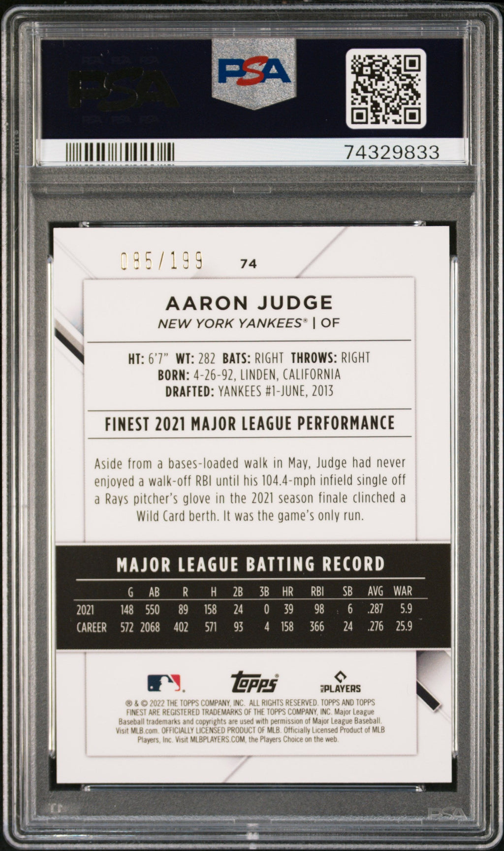 You are purchasing the following: 2022 Topps Finest Aaron Judge Aqua Refractor #74 PSA 9 . You will receive the exact item in the photographs. Note: Please do not connact us and asking the following: 1. What is the lowest you would take? Just make an offer. If the offer is automatically declined, you have your answer. 2. What the best you can do? See above. Not repling to an email is a reply. 3. Any room on this? See above. Not repling to an offer is a reply. 4. We ONLY do one counter offer, so please make your best offer the first time! Note: If the price off, in your option, please send your resaoning and an offer. We will review it. Note: We manage nearly 10 millon cards regularly and will adjust prices as errors are noticed or pointed out! Listed With Mascot.