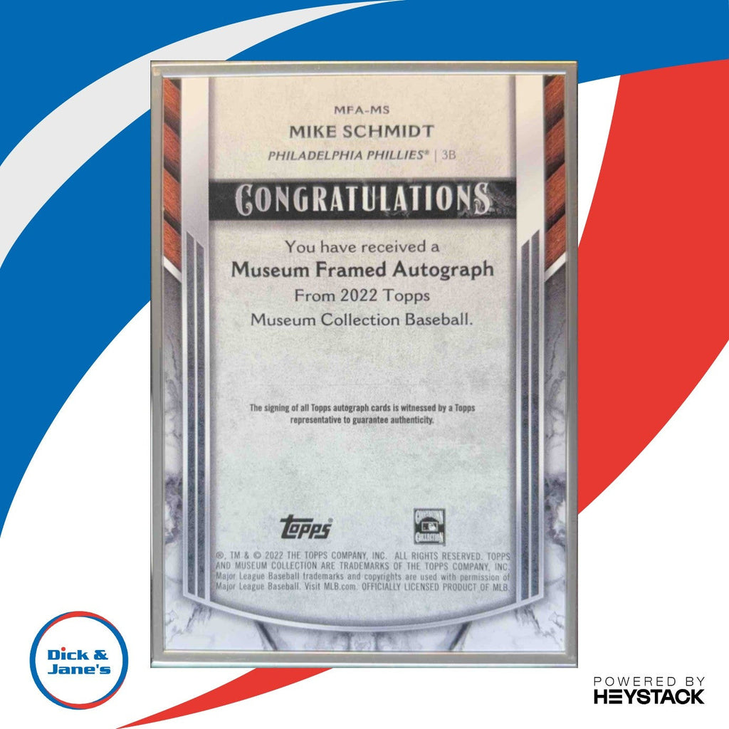 Own a piece of baseball history with this 2022 Topps Museum Collection Mike Schmidt Framed Auto Silver 15/15 Phillies card. Featuring a rare autograph from the MLB legend, this limited edition card is a must-have for any collector. Don't miss out on the chance to add this iconic card to your collection today! Listed With Mascot.