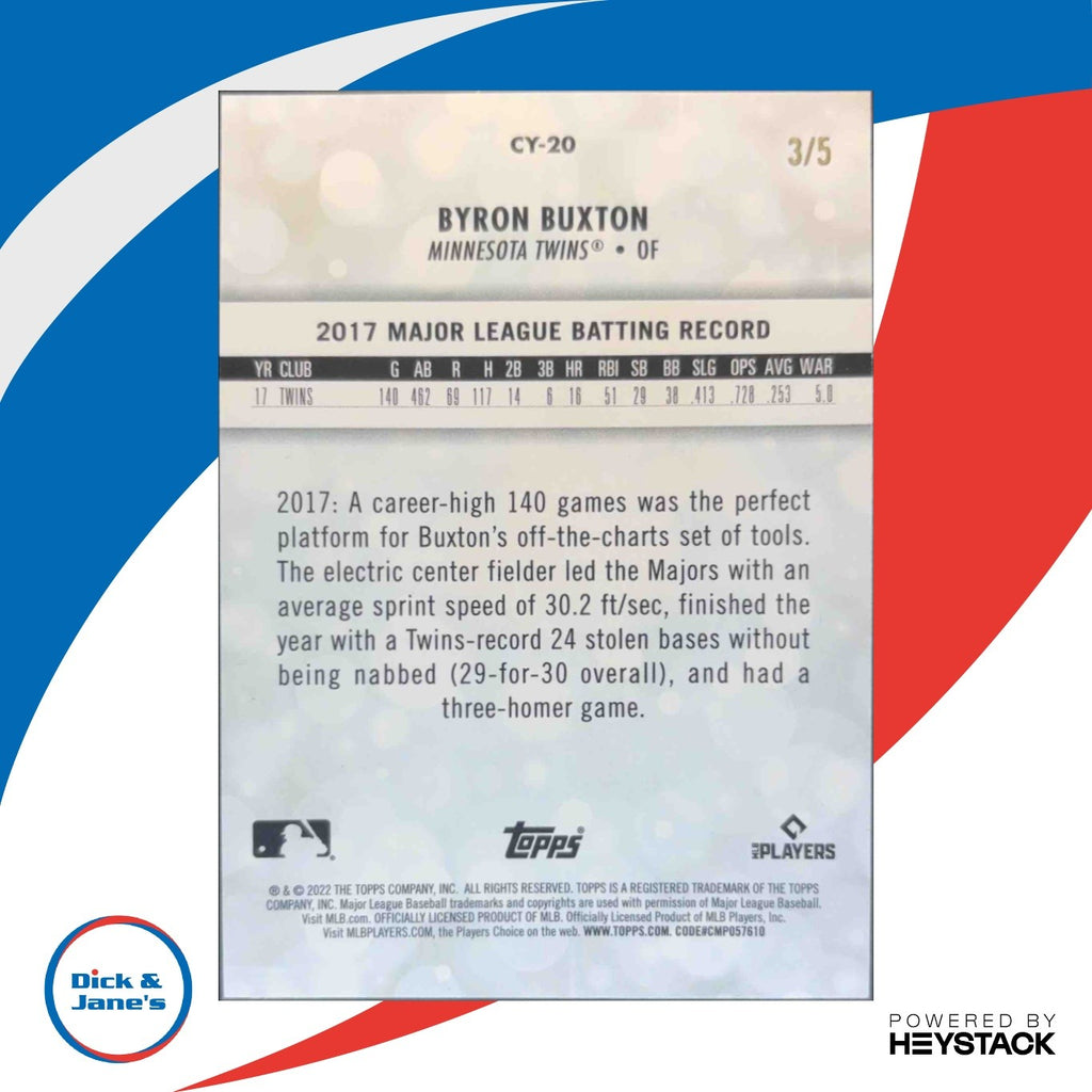Powered by Frooition Home About Us Contact Other Baseball Baseball Rookies Baseball Inserts Baseball Game Used/Relics Baseball Autographed Football Football Rookies Football Inserts Football Game Used/Relics Football Autographed Basketball Basketball Rookies Basketball Inserts Basketball Game Used/Relics Basketball Autographed Hockey NASCAR Hard Cover Books Music CDs Baseball Boxes Baseball Pack Lots Football Boxes Football Pack Lots Other Boxes Othe Pack Lots Magic Singles 2022 Topps UK Edition Byron Buxton Career Year Red 3/5 #CY-20 Minnesota Twins 2022 Topps UK Edition Byron Buxton Career Year Red 3/5 #CY-20 Minnesota Twins Item Description This limited edition 2022 Topps UK Edition Byron Buxton Career Year Red 3/5 #CY-20 trading card is a must-have for Minnesota Twins fans. Featuring the standout player in a career-defining moment, this rare collectible is perfect for any sports card enthusiast looking to add a unique piece to their collection. Don't miss out on owning a piece of baseball history with this stunning card. About Us About Us PSA Grading Consignments Buying Cards EBay Live About Us Yes, there was a Dick & Jane! Originally founded in 1989, Dick & Jane's is Jacksonville's oldest hobby and collectibles store. Our focus is on the collector. We started small with comics, coins and cards and evolved based upon our customers needs and desired and now have 14 employees and over 5 million sportscards and nearly 700,000 different items on our dedicated singles sportscard website We have thousands of raw TCG cards in store. Magic the Gathering and Pokemon! We have Jacksonville s largest selection of graded sports and non-sports cards, all accessible on our website! We engage with our customers! Let us know what you would like to see in the store or changes you would suggest that we make. We would like to start hosting MONTHLY TRADE NIGHTS! We always are buying and trading! WE ARE THE LOCAL HOBBY STORE!!! Stop by if you are in the Jacksonville Area! We are right off I-95 near downtown. PSA Grading PSA Grading We
