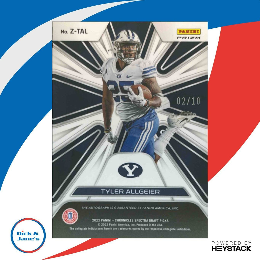 The 2022 Tyler Allgeier Spectra In The Zone Signatures Gold sports trading card is a highly collectible item. This card features a rookie autograph from the player, with only 10 in existence. Don't miss your chance to own this rare and valuable piece of sports memorabilia. Listed With Mascot.