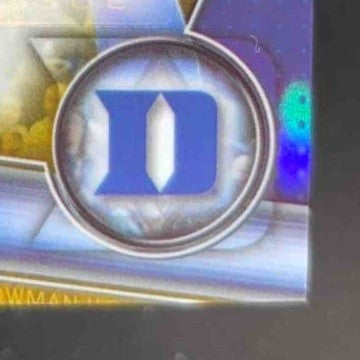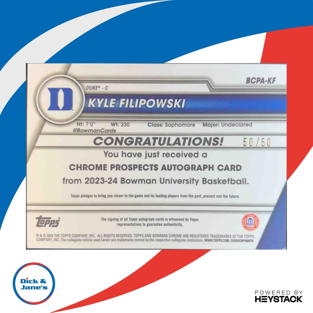2023-24 Bowman University Chrome Kyle Filipowski Auto Gold Lava Refractor 50/50 card, featuring a rare NCAAB autograph. This limited edition trading card is a must-have for collectors and fans alike. Don't miss your chance to own this unique sports memorabilia. Listed With Mascot.