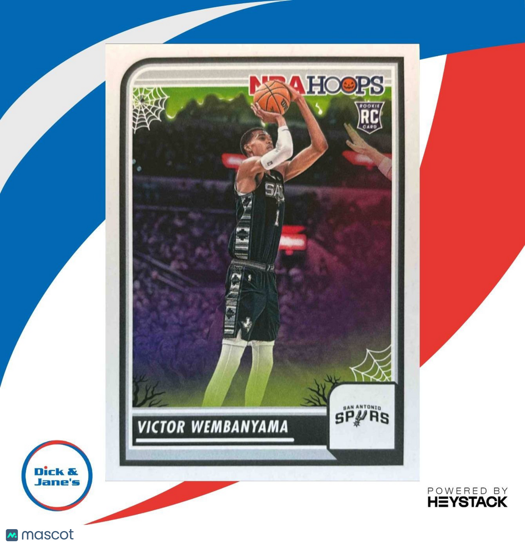 Get your hands on the highly sought-after 2023-24 Panini Hoops Haunted Victor Wembanyama #108 RC San Antonio Spurs trading card! This NBA rookie card features the rising star Victor Wembanyama in his San Antonio Spurs jersey. Don't miss out on adding this rare and collectible card to your collection. Listed With Mascot.