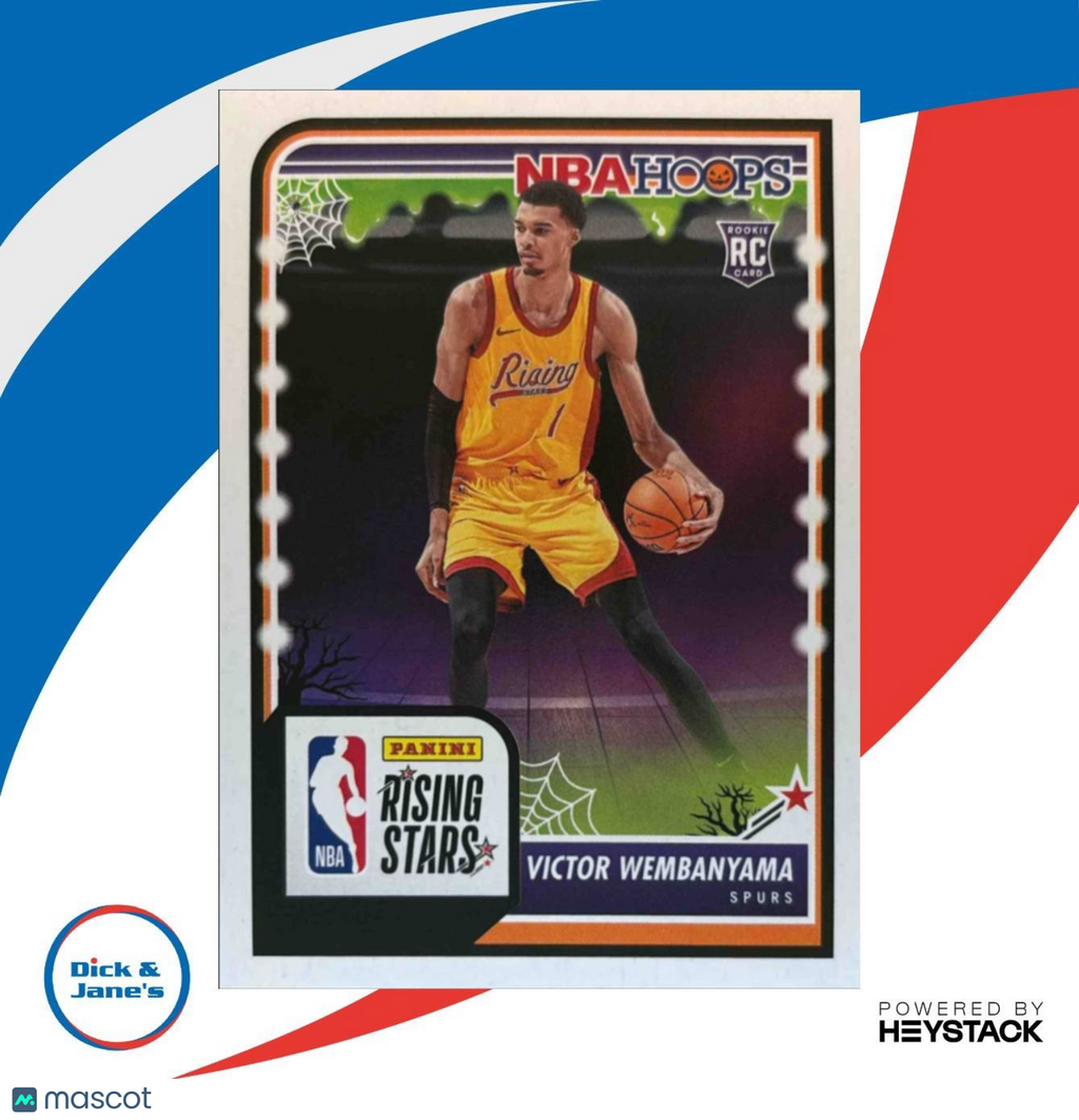 2023-24 Panini Hoops Haunted Victor Wembanyama #282 RC San Antonio Spurs trading card is a must-have for all NBA fans and card collectors. The rookie card features the talented player in action for the Spurs, making it a valuable addition to any collection. Don't miss out on owning this unique and highly sought-after card! Listed With Mascot.