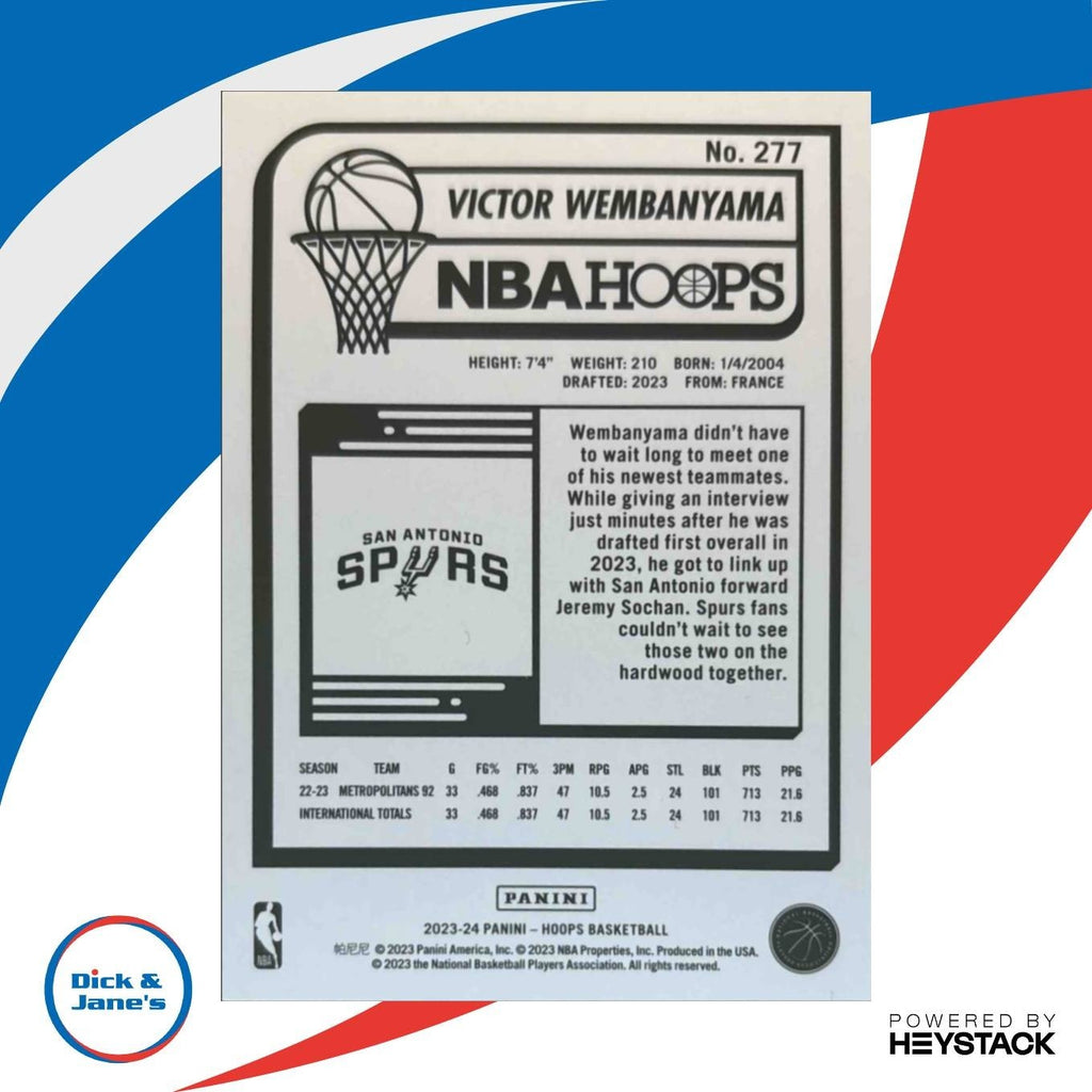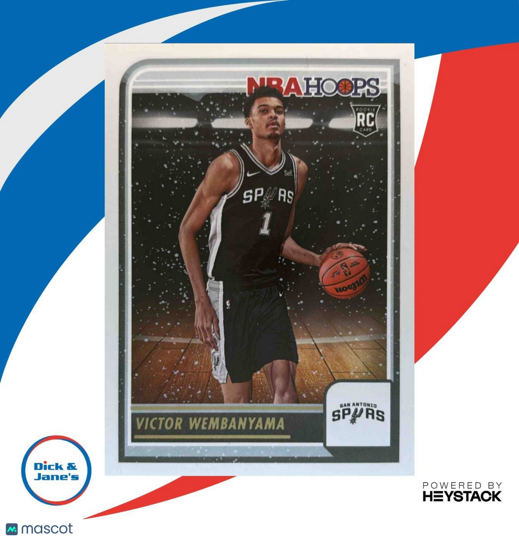 Add this rare 2023-24 Panini Hoops Victor Wembanyama Winter Holiday Snow #277 RC Spurs card to your collection today! This NBA rookie card features the highly touted player in a limited winter holiday snow design. Don't miss out on this must-have card for basketball card enthusiasts. Listed With Mascot.