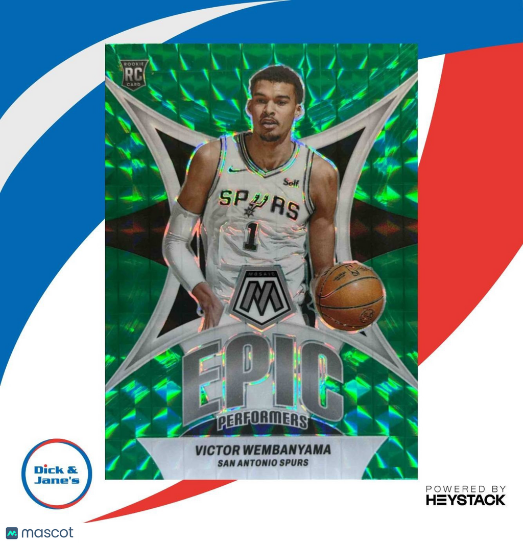 Get your hands on the highly coveted 2023-24 Panini Mosaic Victor Wembanyama Epic Performers Green #12 RC Spurs NBA trading card. This rookie card features the rising star in all his glory, making it a must-have for any collector. Don't miss out on adding this rare and valuable card to your collection! Listed With Mascot.