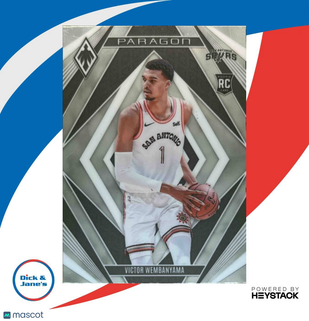 The 2023-24 Panini Phoenix Victor Wembanyama Paragon #13 RC card features the rising star from the San Antonio Spurs. This NBA rookie card is a must-have for any fan or collector looking to add a rare and valuable piece to their collection. Don't miss out on this highly sought-after item! Listed With Mascot.