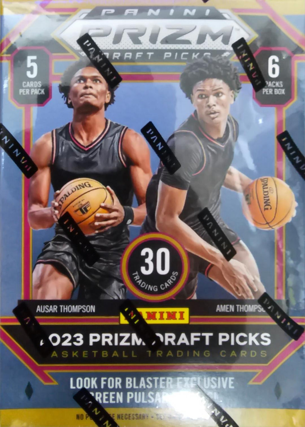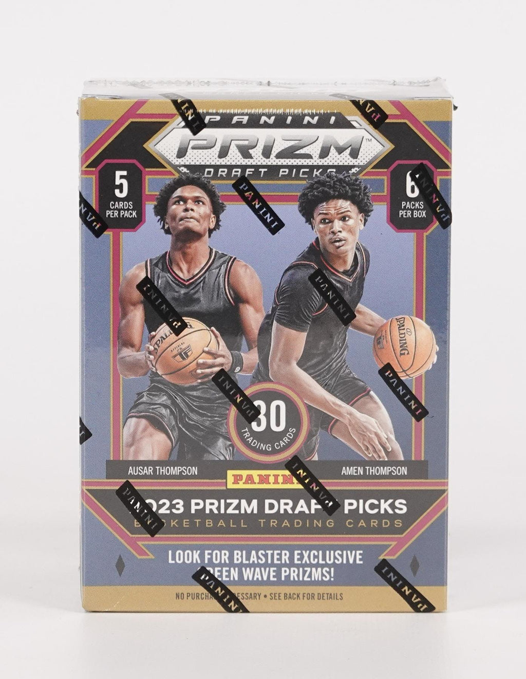 Panini presents the 2023 NBA Prizm Draft Picks Basketball Trading Card Blaster Box featuring a 100-card base set. Each box contains 6 packs with 5 cards per pack. Look for Exclusive Green Prizm Autographs!