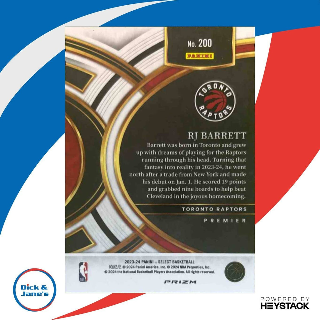 The 2023-24 Panini Select RJ Barrett Tiger Prizms #200 Premier Toronto Raptors trading card is a must-have for any NBA fan or sports collector. Featuring the talented RJ Barrett in a rare Tiger Prizms design, this card is sure to stand out in any collection. Don't miss your chance to own this premier card today! Listed With Mascot.