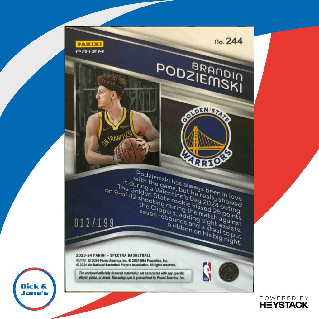 Powered by Frooition Home About Us Contact Other Baseball Baseball Rookies Baseball Inserts Baseball Game Used/Relics Baseball Autographed Football Football Rookies Football Inserts Football Game Used/Relics Football Autographed Basketball Basketball Rookies Basketball Inserts Basketball Game Used/Relics Basketball Autographed Hockey NASCAR Hard Cover Books Music CDs Baseball Boxes Baseball Pack Lots Football Boxes Football Pack Lots Other Boxes Othe Pack Lots Magic Singles 2023-24 Panini Spectra Brandin Podziemski /199 Auto RC Golden State Warriors 2023-24 Panini Spectra Brandin Podziemski /199 Auto RC Golden State Warriors Item Description Add this rare 2023-24 Panini Spectra Brandin Podziemski /199 Auto RC NBA trading card to your collection! Featuring a stunning memorabilia autograph from the Golden State Warriors rookie, this card is a must-have for any basketball card enthusiast. Don't miss out on owning a piece of basketball history! About Us About Us PSA Grading Consignments Buying Cards EBay Live About Us Yes, there was a Dick & Jane! Originally founded in 1989, Dick & Jane's is Jacksonville's oldest hobby and collectibles store. Our focus is on the collector. We started small with comics, coins and cards and evolved based upon our customers needs and desired and now have 14 employees and over 5 million sportscards and nearly 700,000 different items on our dedicated singles sportscard website We have thousands of raw TCG cards in store. Magic the Gathering and Pokemon! We have Jacksonville s largest selection of graded sports and non-sports cards, all accessible on our website! We engage with our customers! Let us know what you would like to see in the store or changes you would suggest that we make. We would like to start hosting MONTHLY TRADE NIGHTS! We always are buying and trading! WE ARE THE LOCAL HOBBY STORE!!! Stop by if you are in the Jacksonville Area! We are right off I-95 near downtown. PSA Grading PSA Grading We
