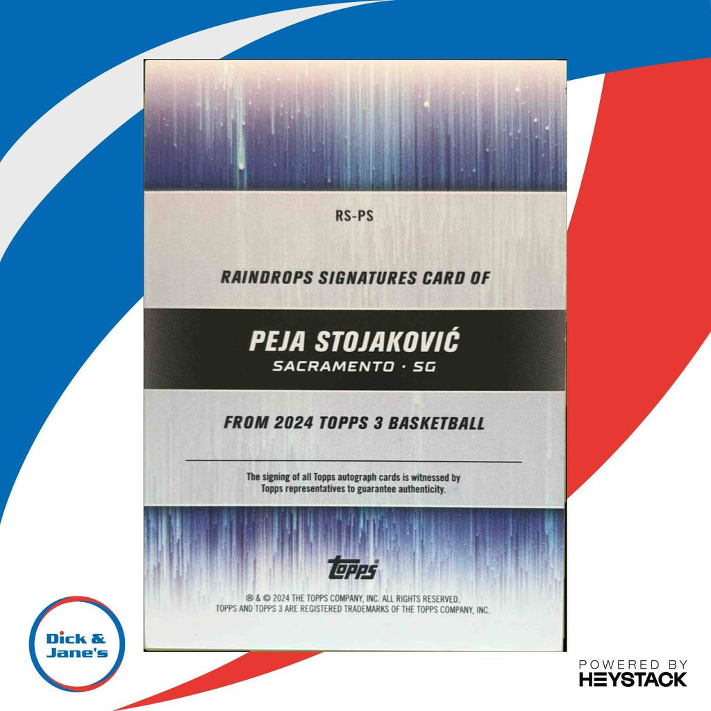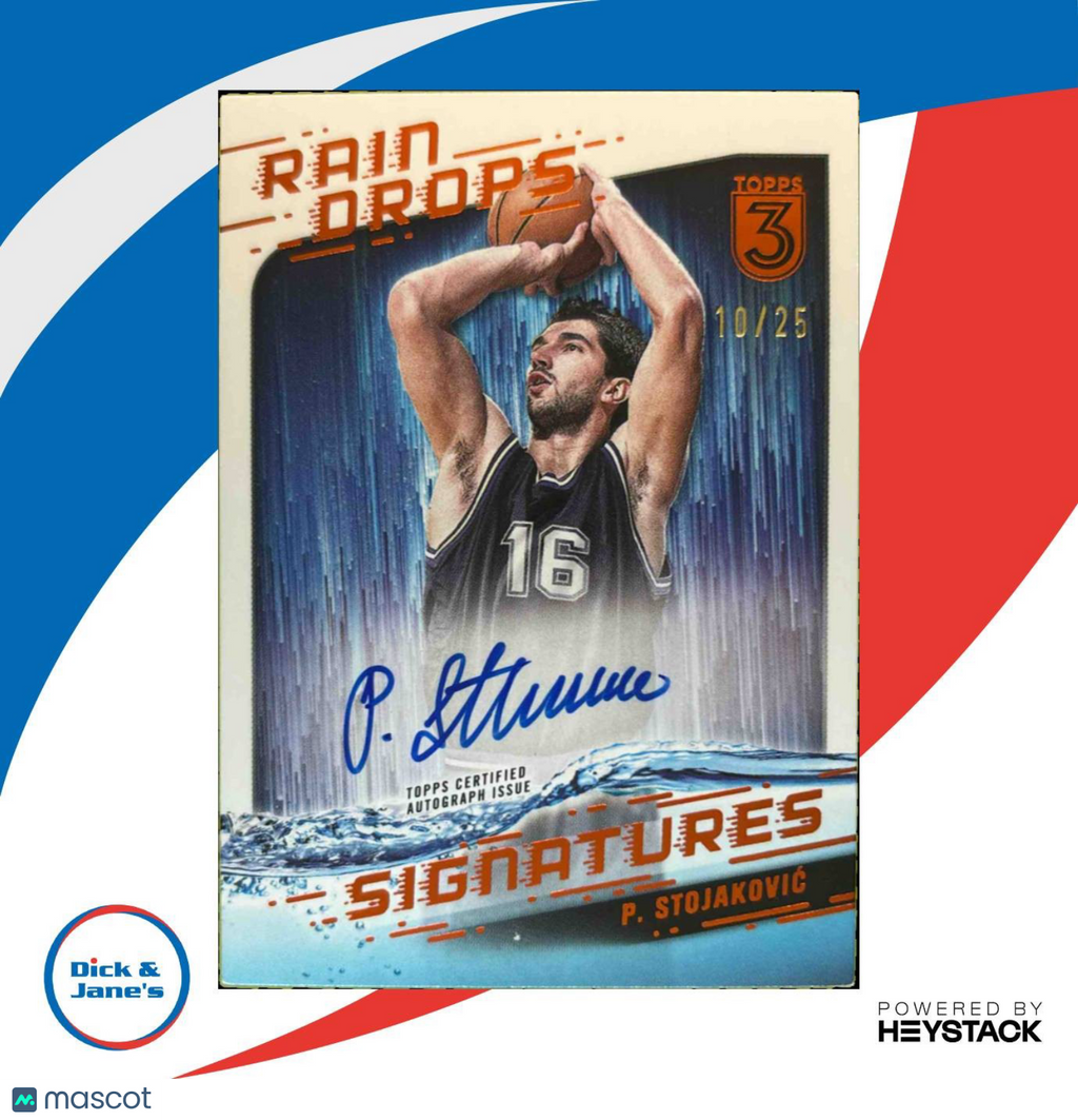 This rare 2023-24 Topps Peja Stojakovic NBA trading card features a stunning bronze Raindrops Signatures Auto, limited to only 25 copies. A must-have for Sacramento Kings fans and collectors of basketball memorabilia. Get your hands on this exclusive piece of NBA history today! #PejaStojakovic #NBA #TradingCard #CollectorItem Listed With Mascot.