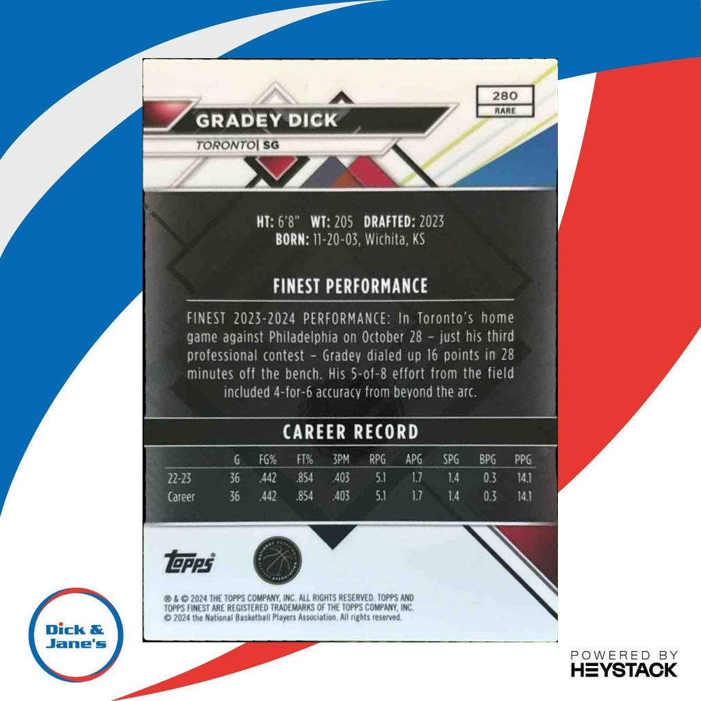 This 2023-24 Topps Finest Gradey Dick Red Refractor card is a highly sought-after NBA rookie card featuring the rising star from the Toronto Raptors. With a limited print of only 5, this rare RC card is a must-have for collectors looking to add a unique piece to their collection. Listed With Mascot.