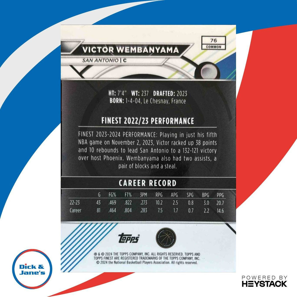 Add this rare 2023-24 Topps Finest Victor Wembanyama #76 Common RC San Antonio Spurs trading card to your collection today! Celebrate the up-and-coming NBA star with this unique and valuable card. Don't miss your chance to own a piece of basketball history. Listed With Mascot.