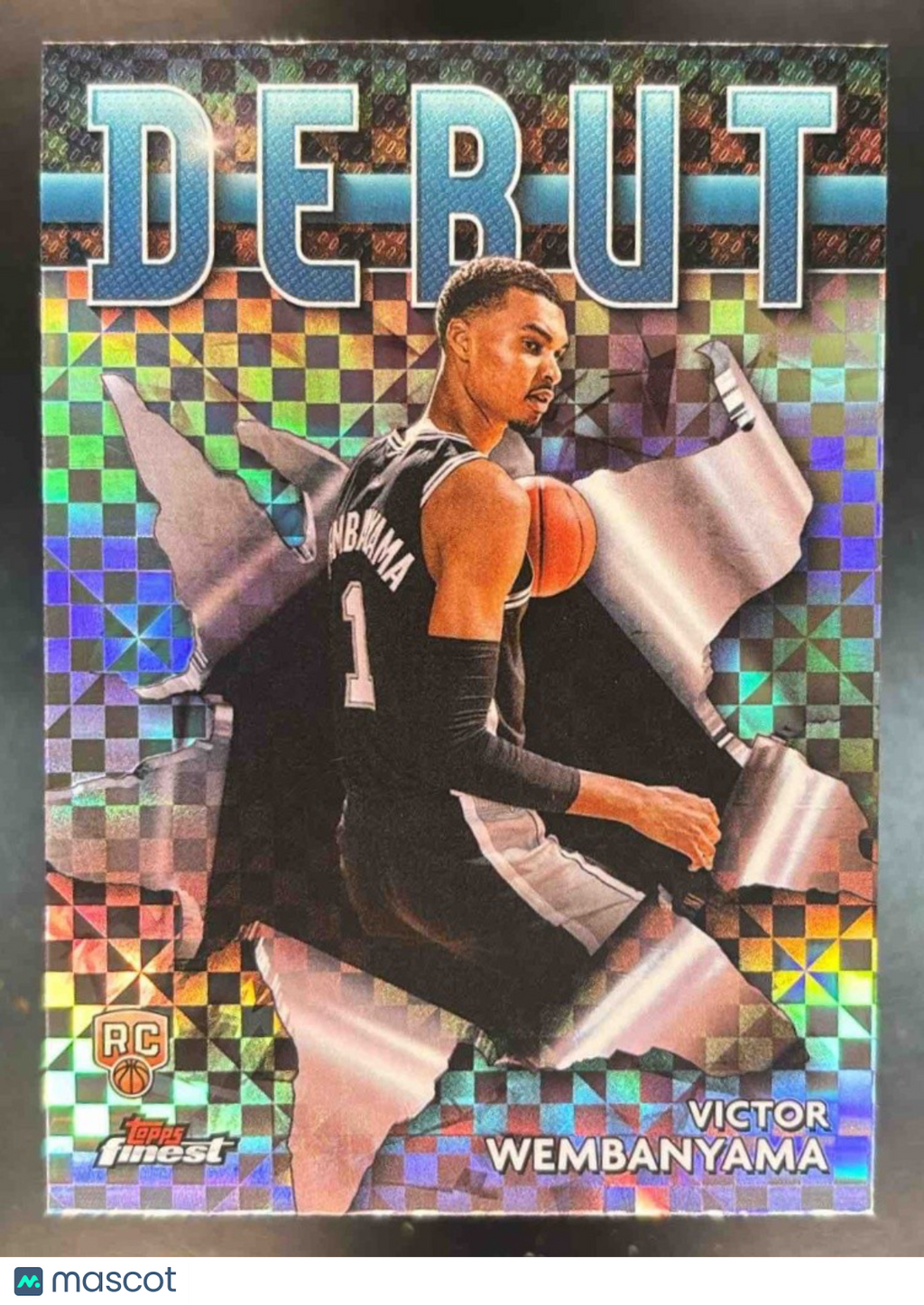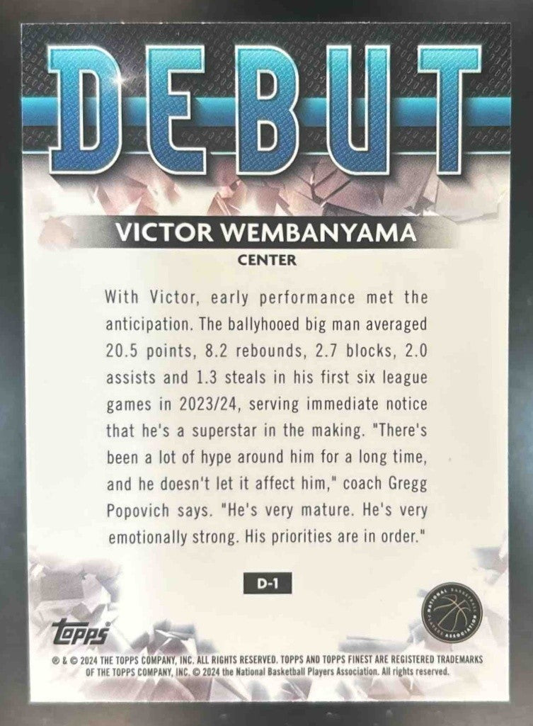 The 2023-24 Topps Finest Victor Wembanyama Debut Checkerboard Refractor RC Spurs trading card is a must-have for any NBA collector. This rare card features Wembanyama during his rookie season with the Spurs, highlighted by a unique checkerboard design. Don't miss out on adding this highly sought-after item to your collection!