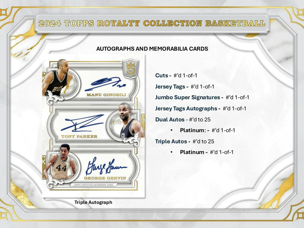 Unwrap 4 Autographs, 2 Memorabilia Cards, 1 Base and 1 Parallel in each box of 2023-24 Topps Royalty Collection Basketball!