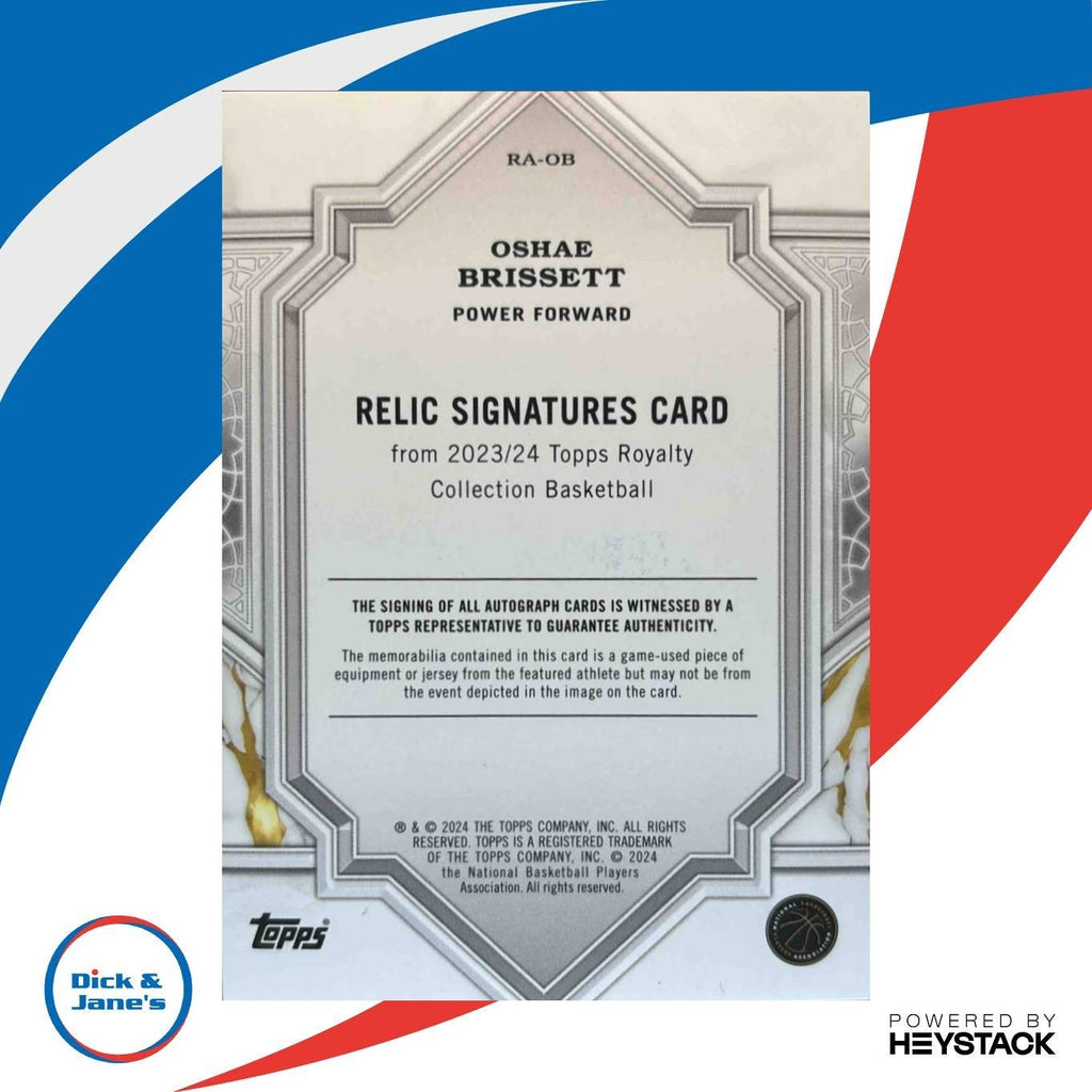 This rare and collectible 2023-24 Topps Royalty Oshae Brissett Relic Signatures Gold /10 MEM Celtics sports trading card features a signed autograph by the player, a piece of memorabilia from the Celtics, and is limited to just 10 copies worldwide. A must-have for any basketball card collector! Listed With Mascot.