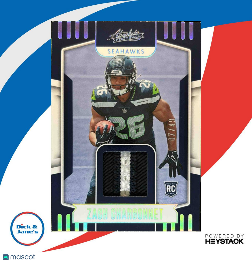2023 Absolute Zach Charbonnet Rookie Materials Holo Silver 7/49 Seattle Seahawks Listed With Mascot.