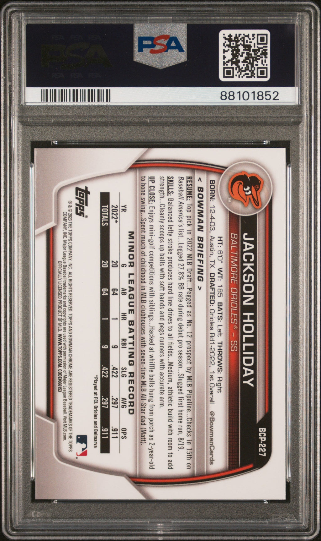 You are purchasing the following: 2023 Bowman Chrome Sapphire Edition Prospects Jackson Holliday #227 PSA 10 . You will receive the exact item in the photographs. Note: Please do not connact us and asking the following: 1. What is the lowest you would take? Just make an offer. If the offer is automatically declined, you have your answer. 2. What the best you can do? See above. Not repling to an email is a reply. 3. Any room on this? See above. Not repling to an offer is a reply. 4. We ONLY do one counter offer, so please make your best offer the first time! Note: If the price off, in your option, please send your resaoning and an offer. We will review it. Note: We manage nearly 10 millon cards regularly and will adjust prices as errors are noticed or pointed out! Listed With Mascot.