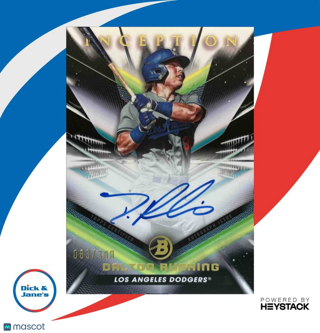 For sale: 2023 Bowman Inception Dalton Rushing Auto baseball trading card. Limited edition #83/300, autographed by Rushing himself. Representing the Los Angeles Dodgers, this MLB collectible is a must-have for any baseball card collector or fan. Don't miss out on your chance to own a piece of baseball history! Listed With Mascot.