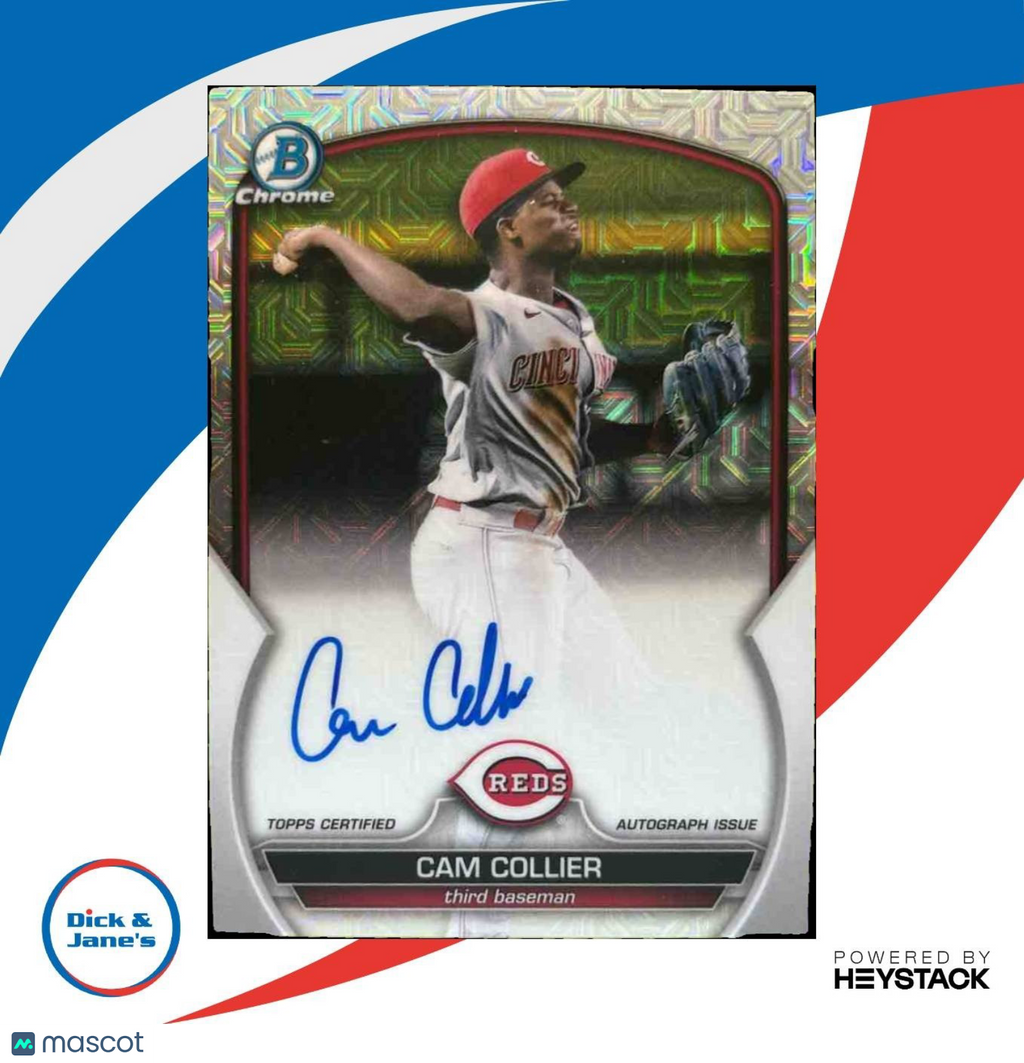2023 Bowman Mega Box Cam Collier Chrome Prospects Auto Mojo Cincinnati Reds trading card featuring an authentic auto signature from the player. Perfect for collectors looking to add a rare and valuable item to their collection. Don't miss out on this exclusive MLB card! Listed With Mascot.