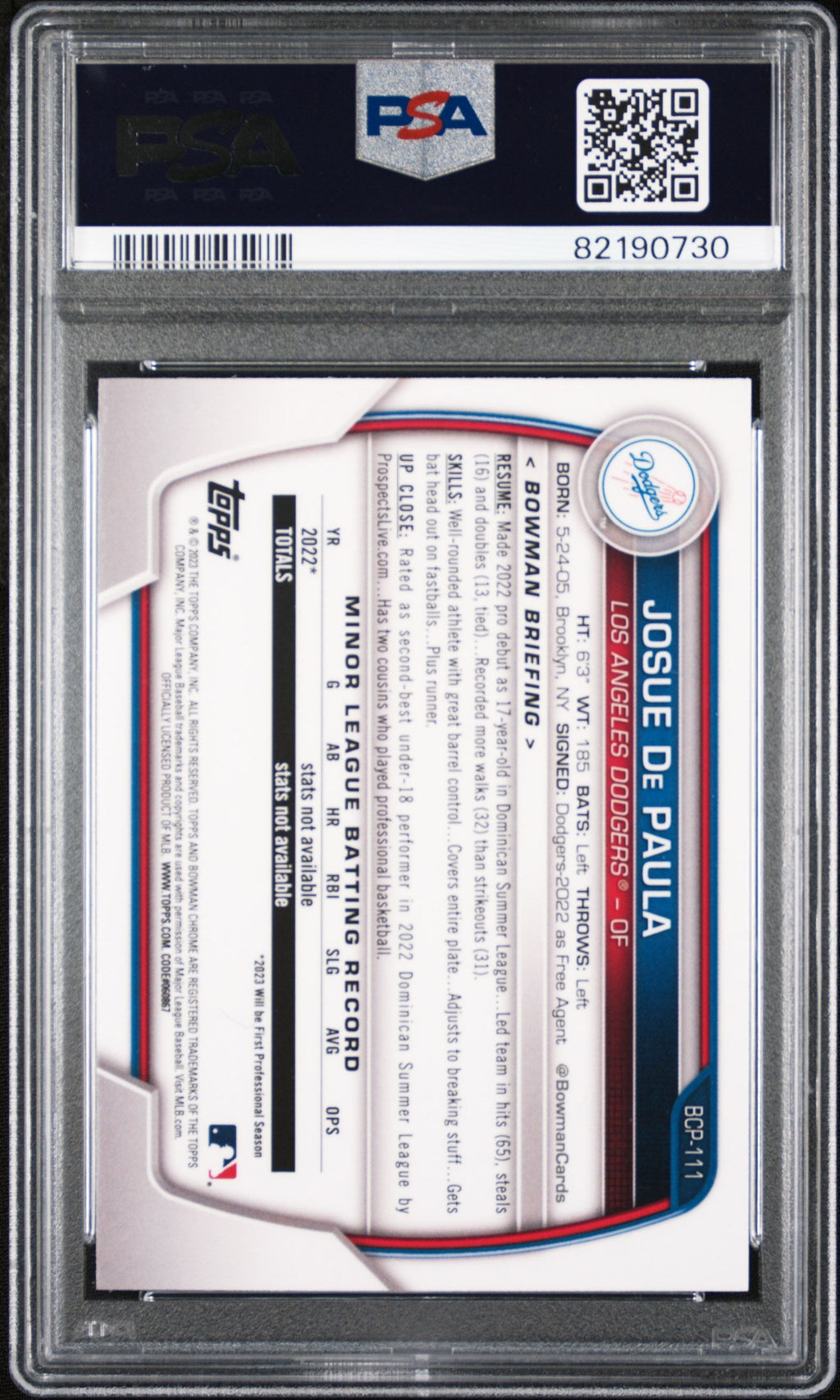You are purchasing the following: 2023 Bowman Mega Box Chrome Josue De Paula #111 PSA 10 . You will receive the exact item in the photographs. Note: Please do not connact us and asking the following: 1. What is the lowest you would take? Just make an offer. If the offer is automatically declined, you have your answer. 2. What the best you can do? See above. Not repling to an email is a reply. 3. Any room on this? See above. Not repling to an offer is a reply. 4. We ONLY do one counter offer, so please make your best offer the first time! Note: If the price off, in your option, please send your resaoning and an offer. We will review it. Note: We manage nearly 10 millon cards regularly and will adjust prices as errors are noticed or pointed out! Listed With Mascot.