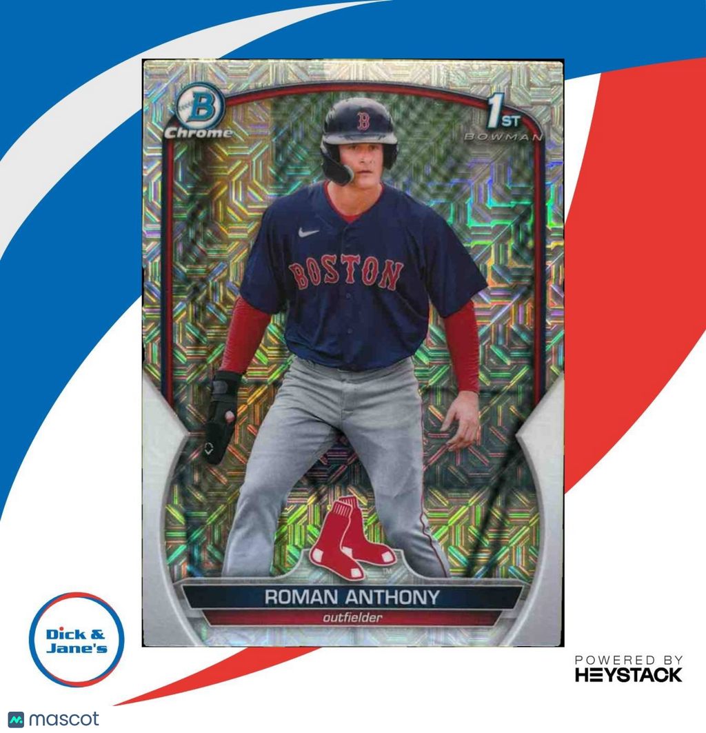 2023 Bowman Mega Box Roman Anthony Prospects Mojo Refractor #BCP-71 Red Sox trading card. Features Roman Anthony, a top MLB prospect from the Boston Red Sox. This rare Mojo Refractor card is a must-have for any collector. Get your hands on this exclusive card today! #MLB #RedSox #TradingCard Listed With Mascot.