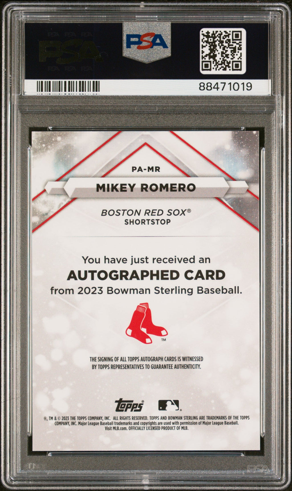 You are purchasing the following: 2023 Bowman Sterling Prospect Autographs Mikey Romero Speckle Ref 94/99 #PAMR PSA 10 Boston Red Sox. You will receive the exact item in the photographs. Note: Please do not connact us and asking the following: 1. What is the lowest you would take? Just make an offer. If the offer is automatically declined, you have your answer. 2. What the best you can do? See above. Not repling to an email is a reply. 3. Any room on this? See above. Not repling to an offer is a reply. 4. We ONLY do one counter offer, so please make your best offer the first time! Note: If the price off, in your option, please send your resaoning and an offer. We will review it. Note: We manage nearly 10 millon cards regularly and will adjust prices as errors are noticed or pointed out! Listed With Mascot.