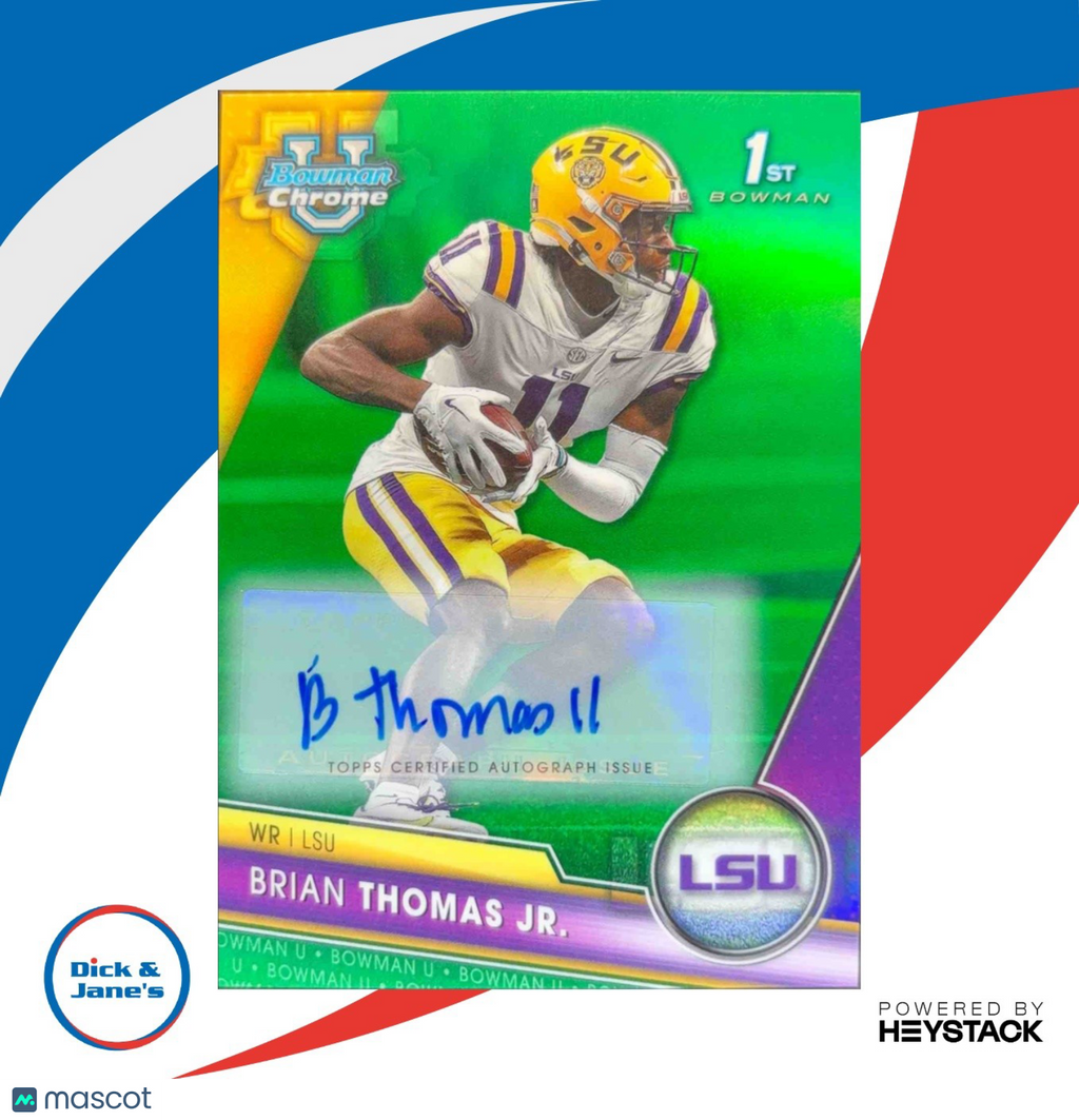 Own a piece of college football history with this 2023 Bowman University Chrome Brian Thomas Jr Auto Green Refractor 48/99 LSU RC trading card. Featuring the rising star's autograph and limited edition green refractor, this card is a must-have for any collector or LSU fan. Don't miss out on adding this rare and unique card to your collection! Listed With Mascot.
